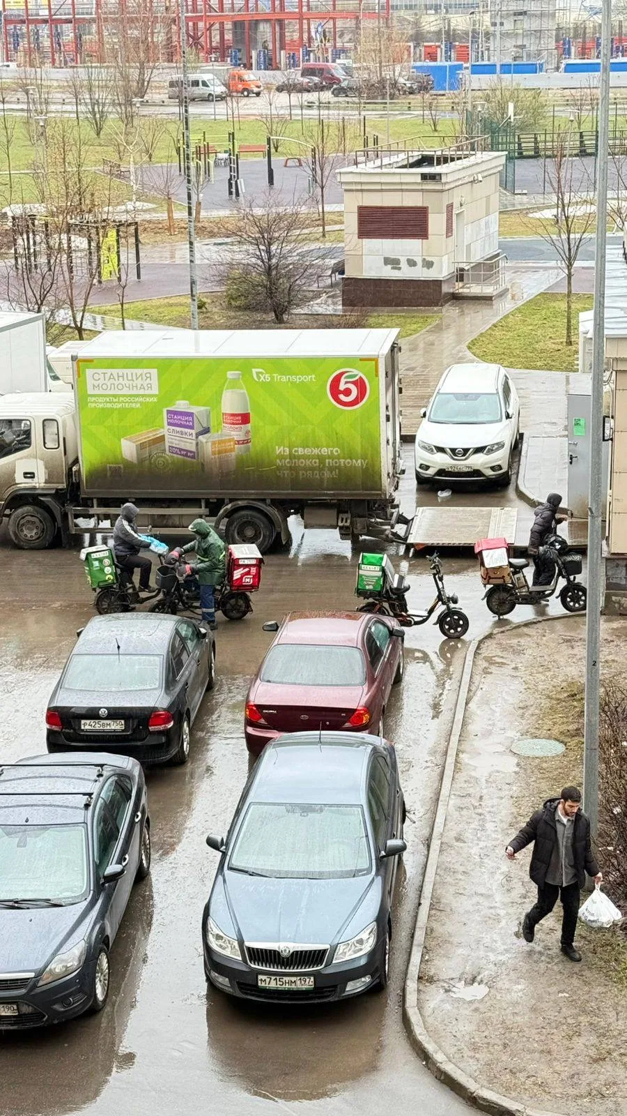 грузовики, курьеры, постоянное движение во дворе.