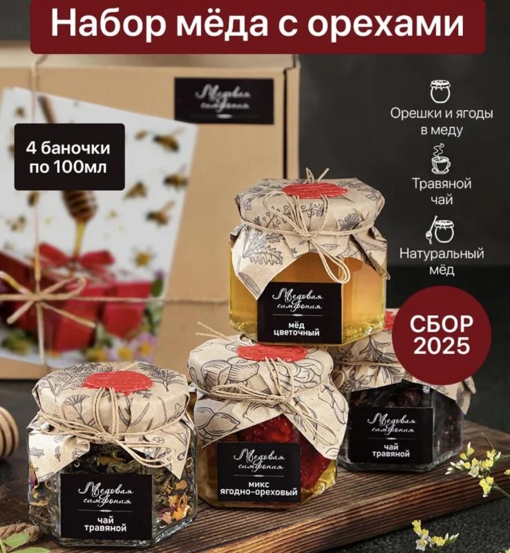 Это вкусный и полезный подарок на любое значимое событие. В наборе отборный мед, орехово-ягодный микс (кешью, миндаль, фундук, грецкий орех), чай «Ночь Клеопатра» и чай «Летний сад».