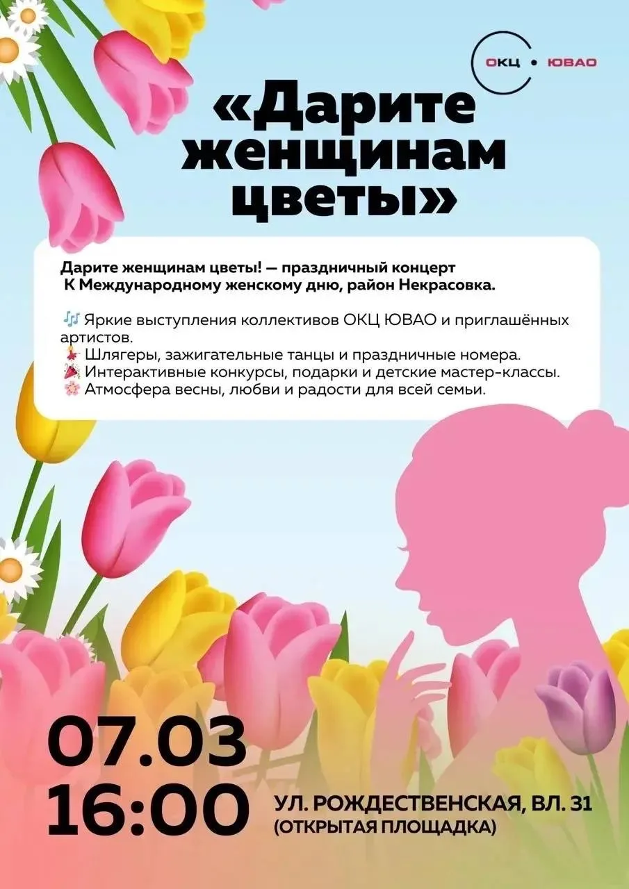 Уютный праздник «Дарите женщинам цветы» состоится 7 марта на свежем воздухе. Это будет день, наполненный улыбками, творчеством и весенним настроением.
