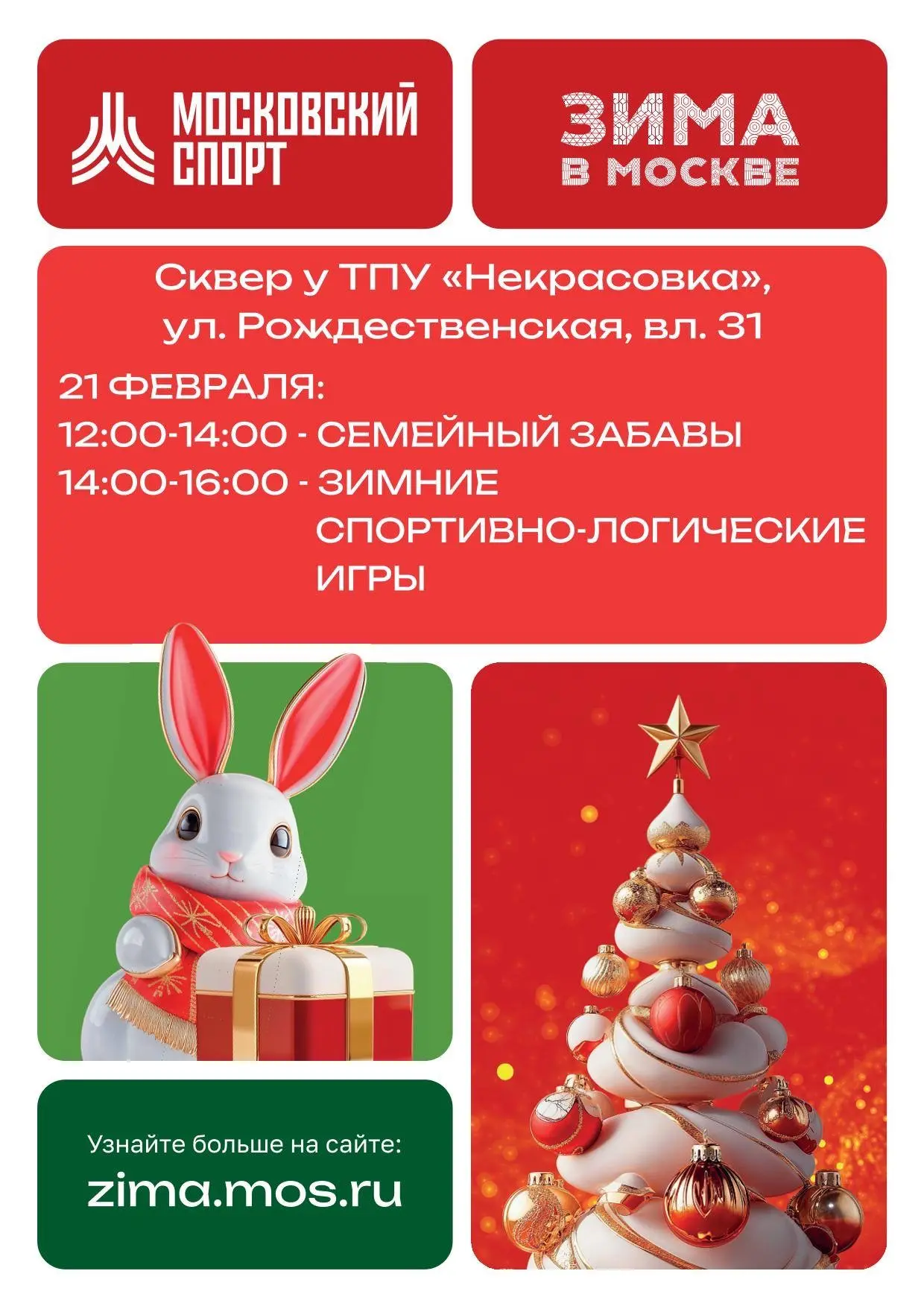 21 февраля с 12:00 до 16:00 в сквере у ТПУ «Некрасовка» будет по-настоящему весело, шумно и активно. Ждём родителей, детей, бабушек и дедушек — всех, кто любит движение и хорошее настроение!