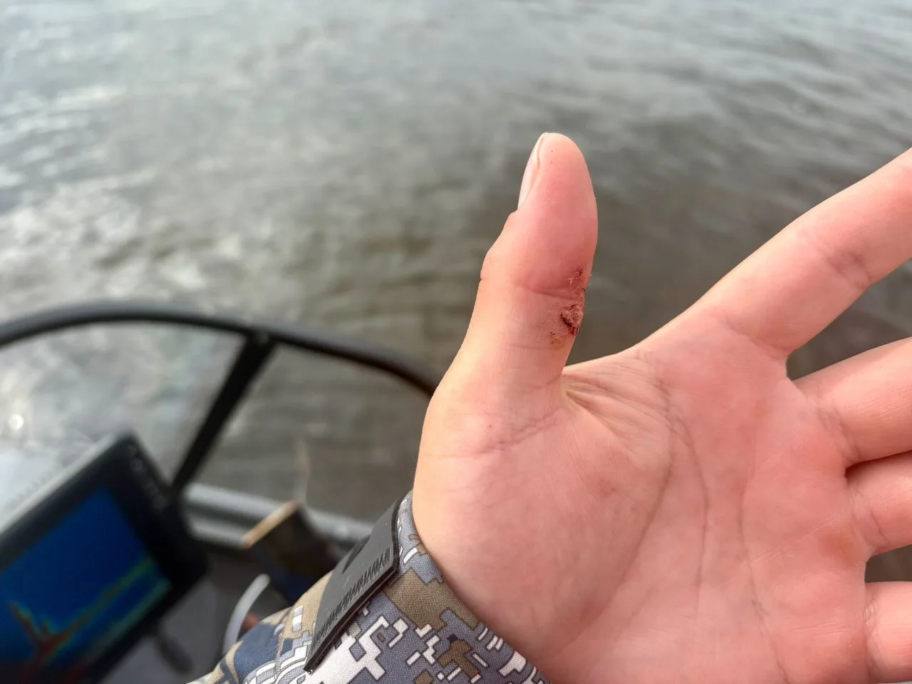 По странному стечению обстоятельств, когда я начал отцеплять зубастую, она умудрилась пробить палец сквозь перчатку. Сначала вроде пустяк, но уже через час палец распух, как сосиска, а спустя еще пару часов я вовсе не мог согнуть кисть, но рыбалку мы не завершили. Только сегодня отек начал спадать, и стало легче.
