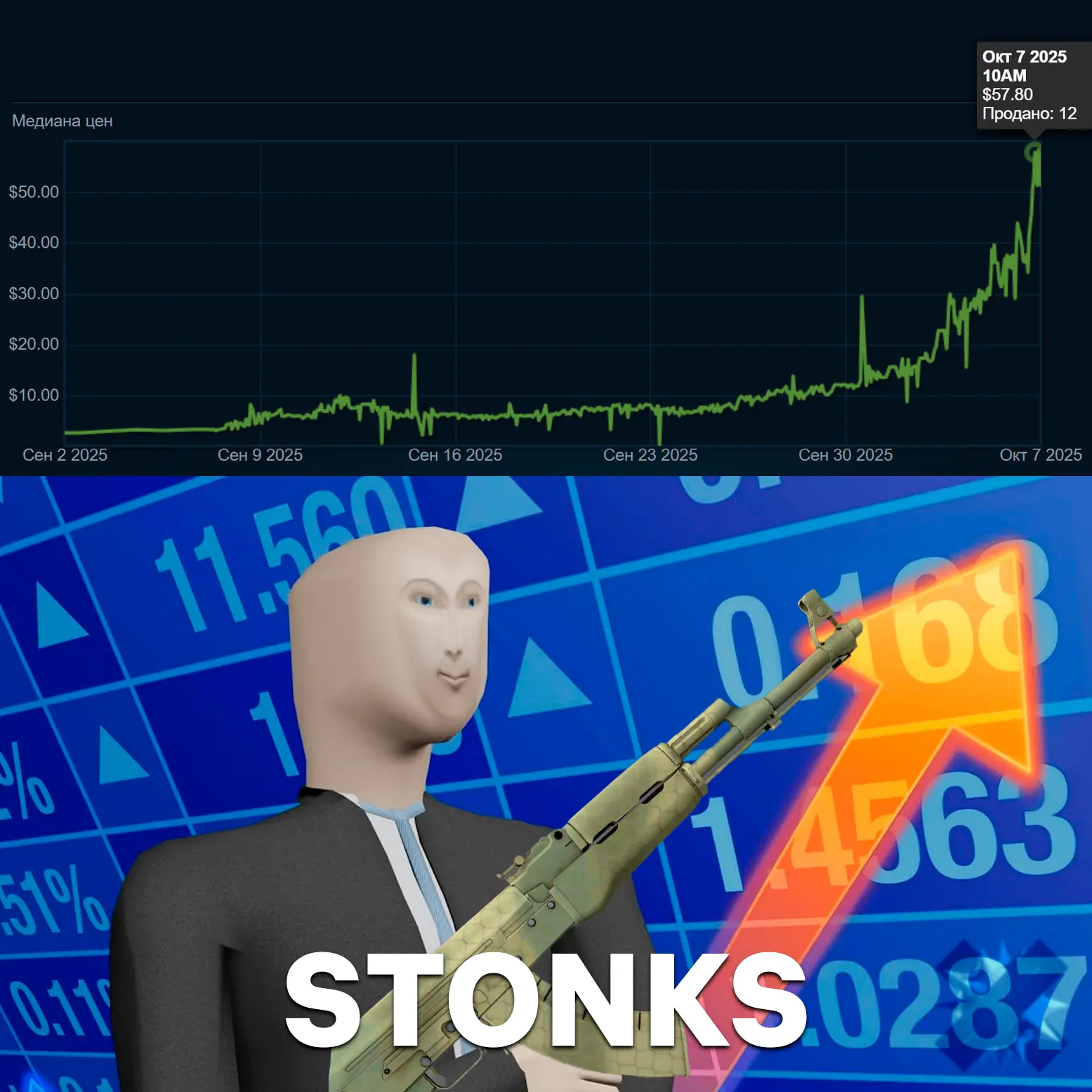 AK-47 «Африканская сетка» (Прямо с завода) внезапно подорожал в 25 раз – с 200 до 5000 рублей. Причина проста: ютубер TrueDad выкупил около 7 тысяч таких скинов, после чего цена улетела в космос.