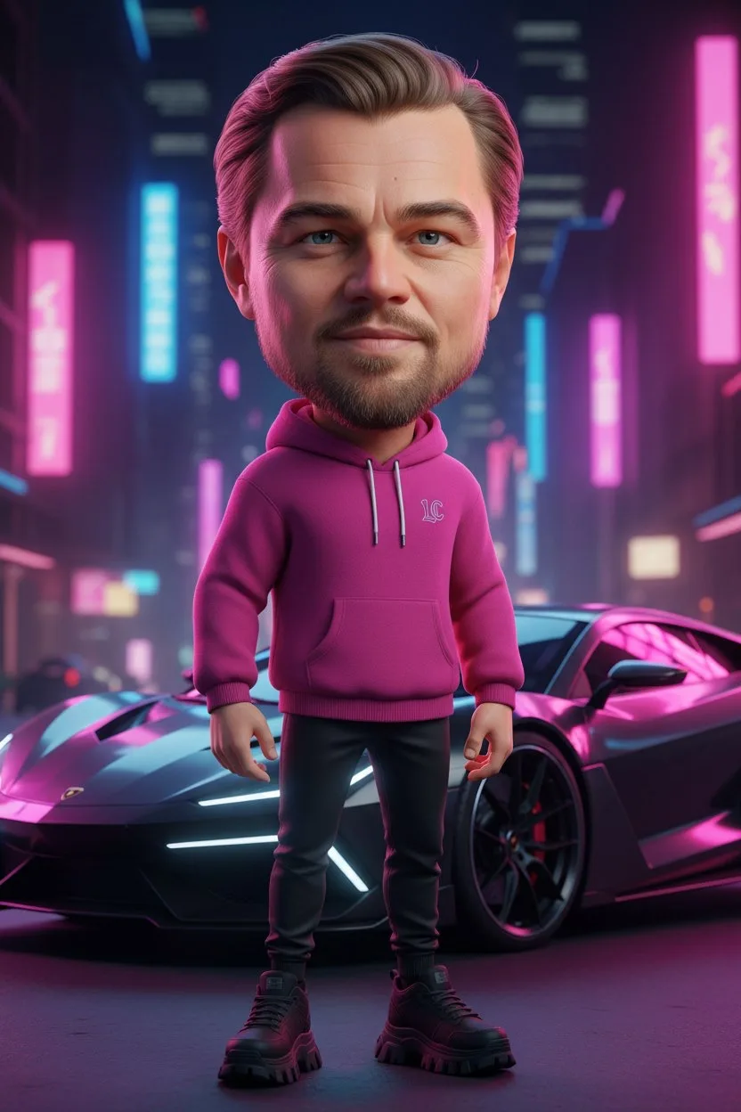 Ultra-detailed 3D cartoon character with an oversized head and highly realistic facial features matching photo reference, posed in front of a sleek sports car under a neon-lit night cityscape; vibrant neon pinks, blues and purples reflecting off metal surfaces; dramatic cinematic lighting, high-resolution, photorealistic textures; wearing a fuchsia hoodie (soft brushed cotton texture, hood down, subtle zipper,logo [LC]), black tapered joggers (sleek fabric, subtle sheen, tailored tapered fit, ribbed cuffs, natural fabric folds), and chunky black sneakers (matte leather and rubber, thick lug soles); streetwear styling, realistic cloth shading, rim light highlighting silhouette, shallow depth of field, 8k, photoreal, cinematic composition; plus heavy-duty black sneakers (oversized chunky design, reinforced toe, carbon-fiber accents) and black tapered pants (sleek fabric, subtle sheen, tailored fit).