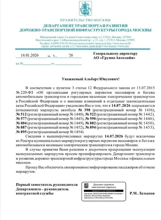 Это коммерческие маршруты № 398, 592, 522, 577, 882, 887, 895 (в Новую Москву) и некоторых других. В дептрансе Москвы сообщили, что они дублируют городские маршруты автобусов и электробусов.