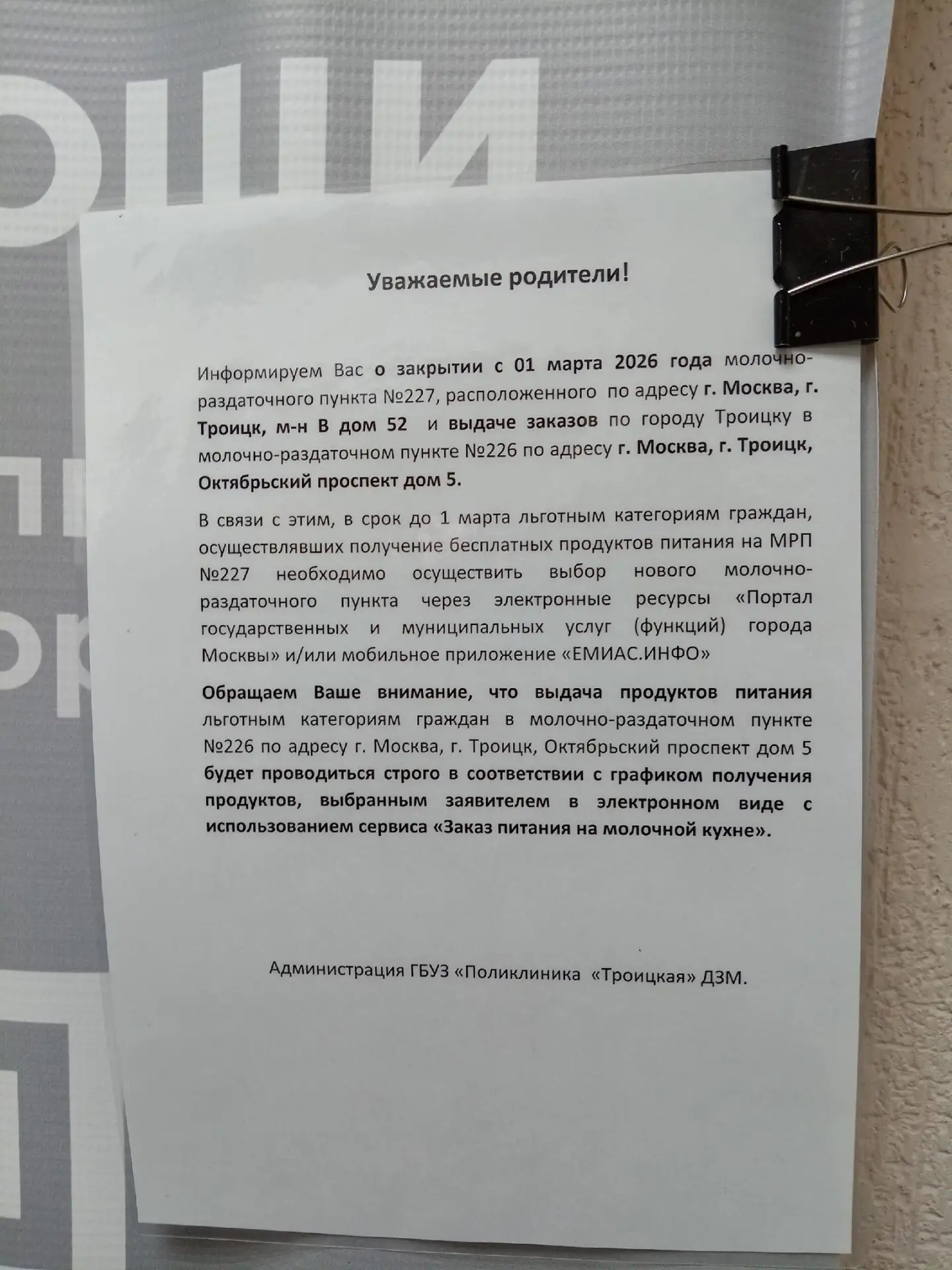 В марте молочно-раздаточный пункт переезжает из Микрорайона «В», дом 52 в детскую поликлинику.