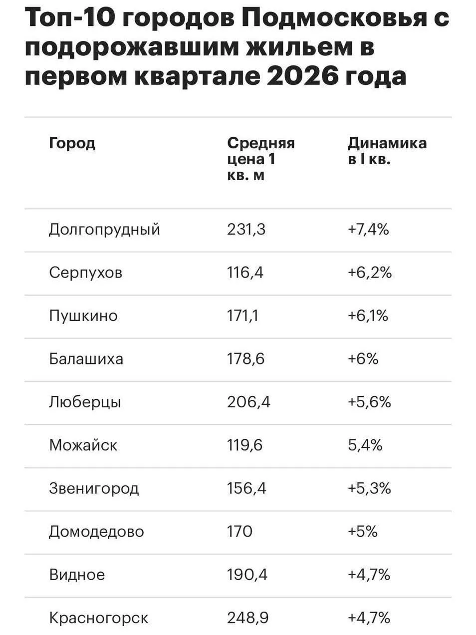 Наибольший прирост показал Долгопрудный: там стоимость жилья выросла на 7,4% — до 231,3 тыс. рублей за кв. м. Следом идёт Серпухов с увеличением на 6,2% (до 116,4 тыс.).