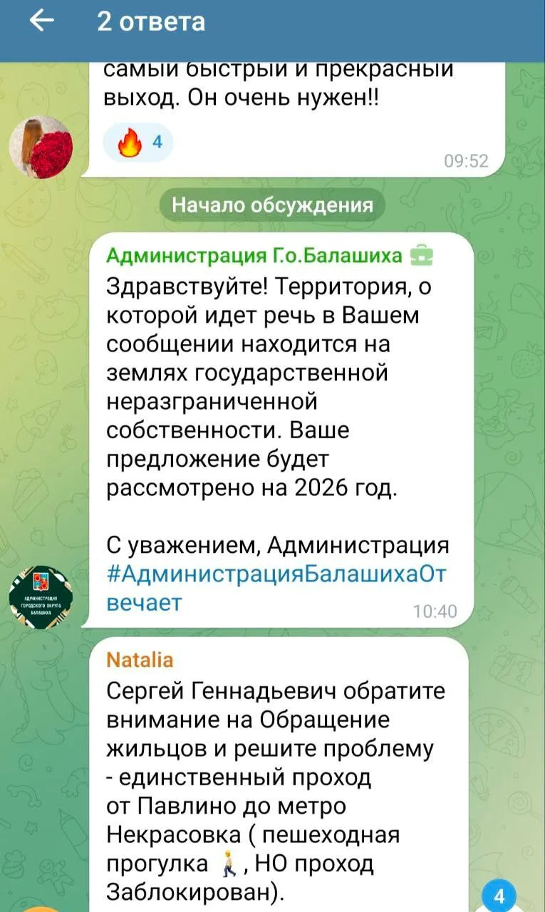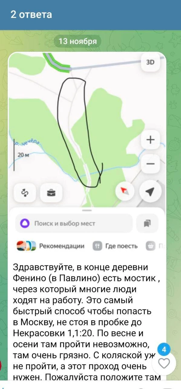 «Здравствуйте,Сергей Геннадьевич. В прошлом году писали обращение по поводу необходимости сделать пешеходный тротуар,а также отремонтировать мост через реку. Каждый день сотни жителей микрорайона используют данный маршрут, чтобы пройти к автобусной остановке в г.Москва ,минуа более чем 2-х часовые пробки на дорогах в сторону метро Некрасовка. В ответе от администрации было указано ( смотрите скриншот), что данный вопрос будет рассмотрен в 2026 году, закончился первый квартал этого года,что решила администрация, будет ремонт моста, тротуарная дорожка к нему от деревни Фенино?»