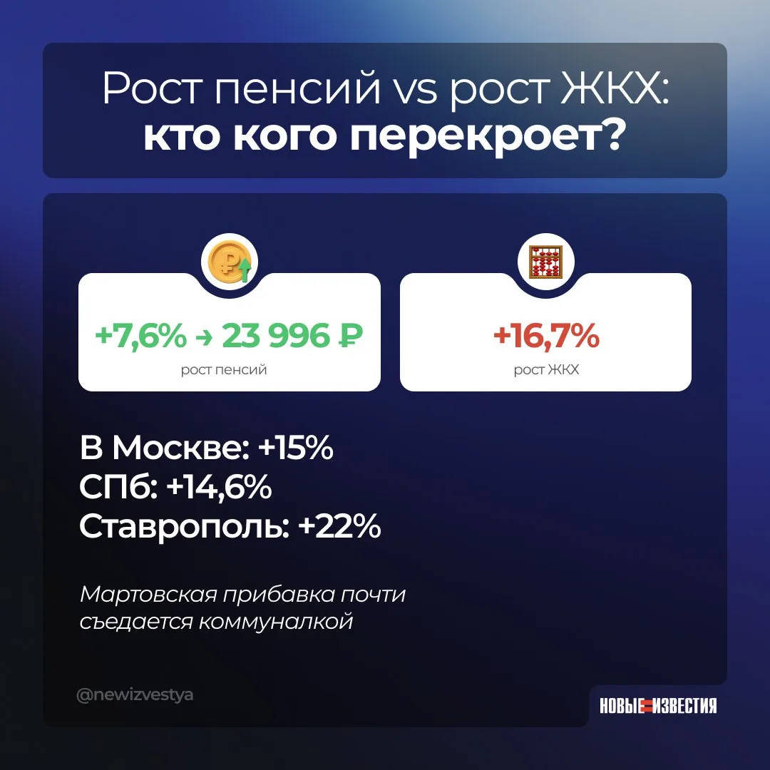 В январе 2026 года пенсии выросли на 7,6%, а тарифы ЖКХ в крупных городах за год могут вырасти до 16–22%. Продукты подорожали на 10–20%.