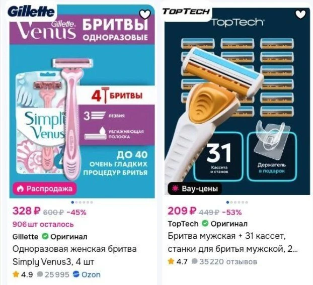 Мужские одноразовые станки базовых серий стоят в среднем 40–45 рублей за штуку в пересчете на большую упаковку. В то же время абсолютно аналогичные по количеству лезвий и качеству стали женские бритвы уже в 60–75 рублей.