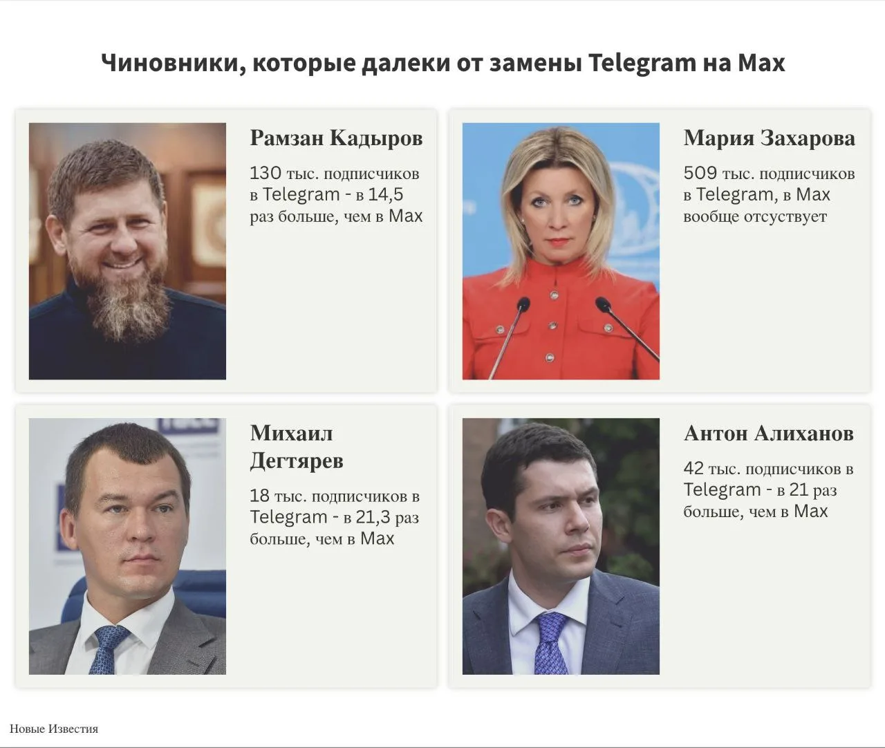 «НИ» изучили пути «миграции по соцсетям» наиболее заметных в медийном поле высокопоставленных слуг народа и пришли к выводу, что им предстоит еще ломать себя и ломать очень большая работа для перехода в национальный мессенджер, да еще и вместе со своей аудиторией: в среднем в Telegram у них в 7,5 раз больше подписчиков, чем в Max.