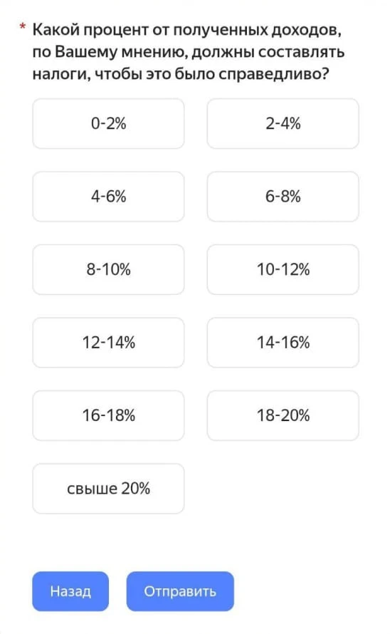 Какой налог самозанятые считают «справедливым», решила узнать ФНС. В личных кабинетах на платформе «Мой налог» появилась анкета, где самозанятым предлагают выбрать, какой процент от дохода они готовы платить — от 0% до более 20%. Заодно спрашивают, что они сделают, если ставка станет «неприемлемой»: уйдут в тень, поменяют систему налогообложения, найдут работу по найму или вообще закроются.