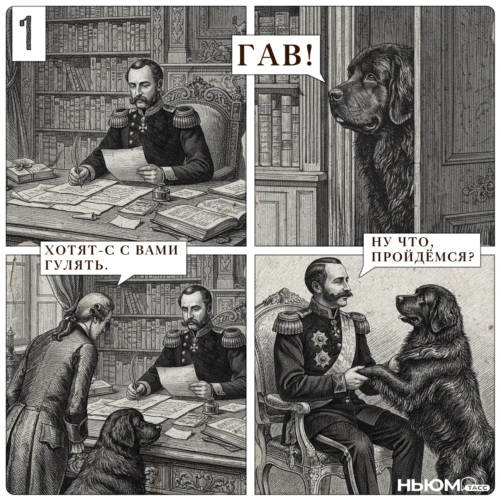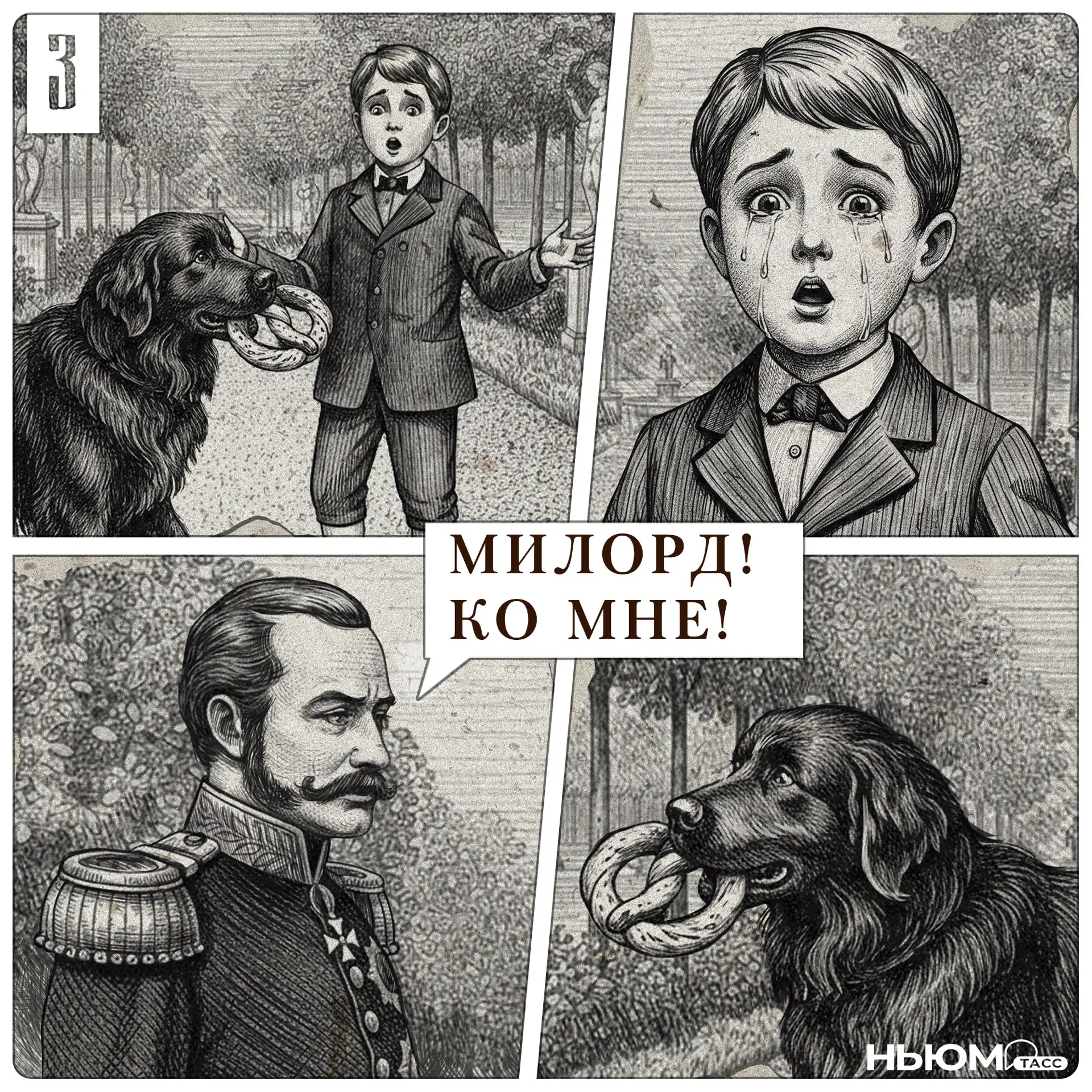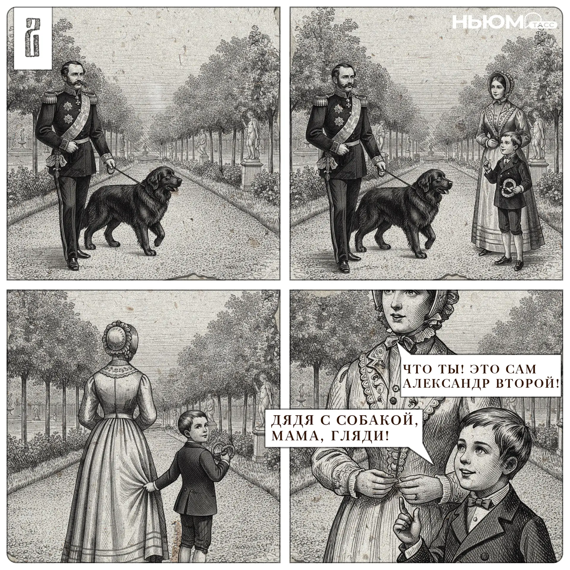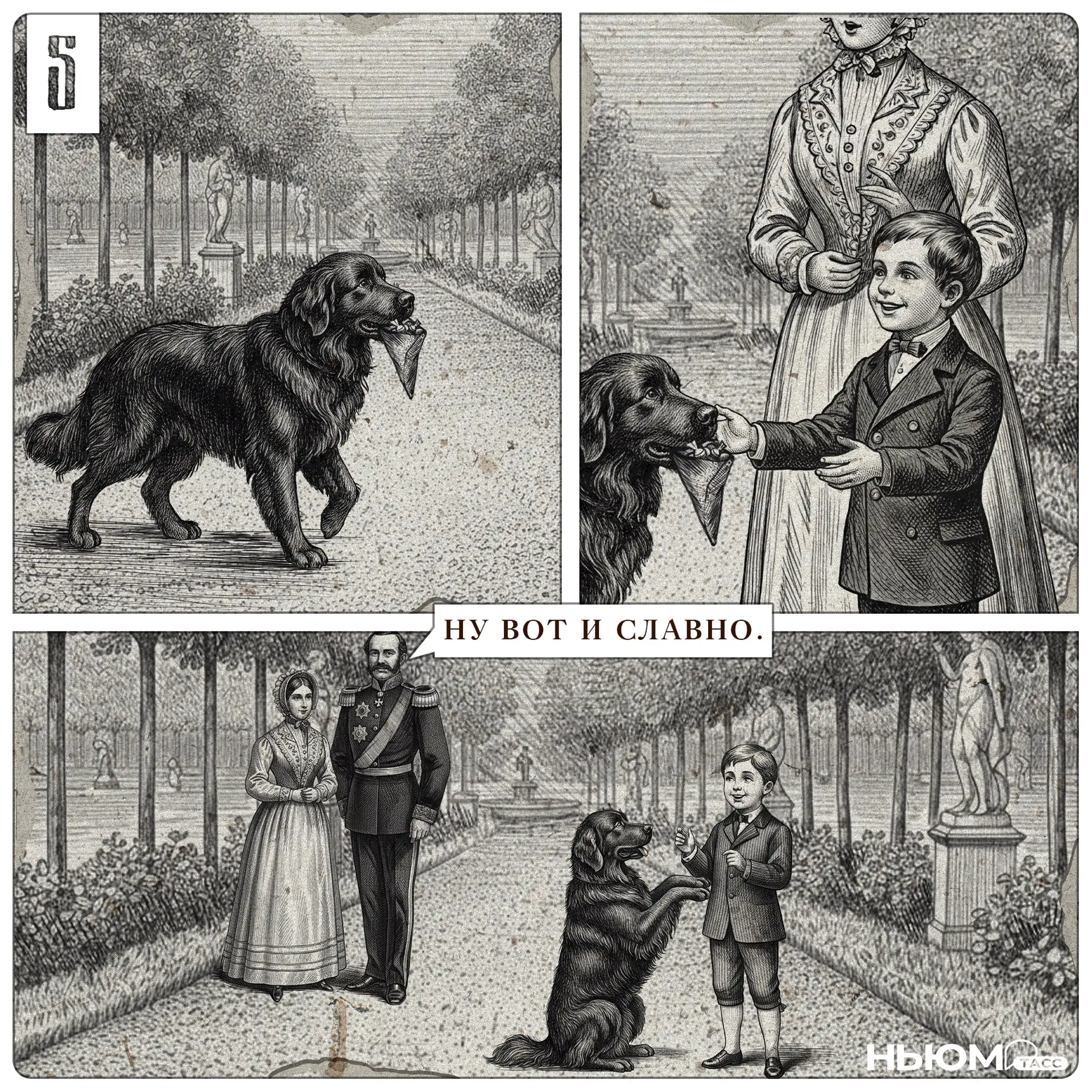 Какая провинность любимой собаки заставила Александра II срочно скупать конфеты в Летнем саду? 🍬Исторический комикс о прогулке царя, которая обернулась конфузом.