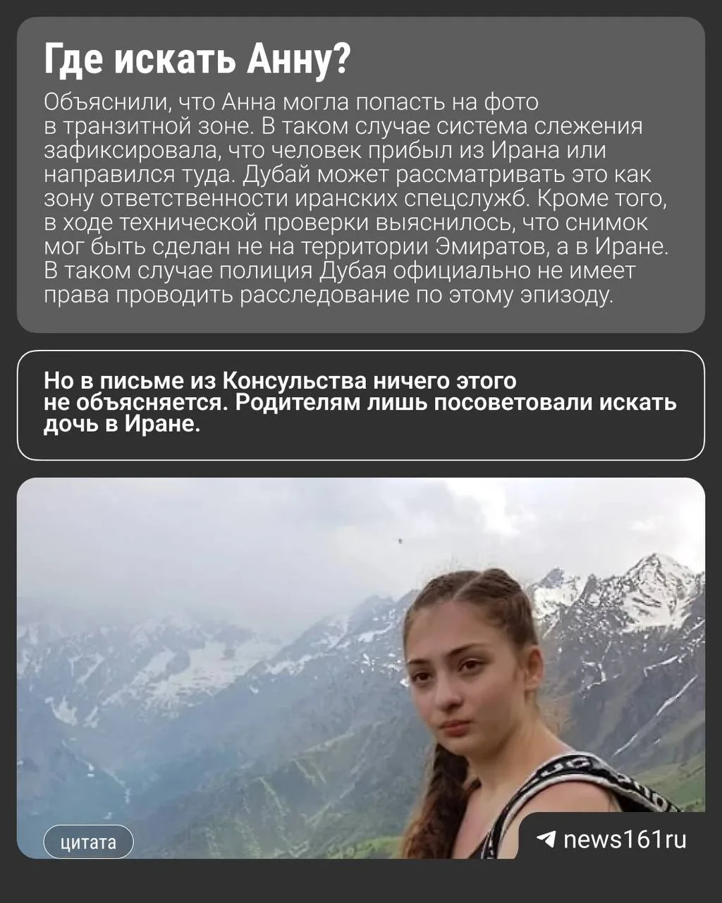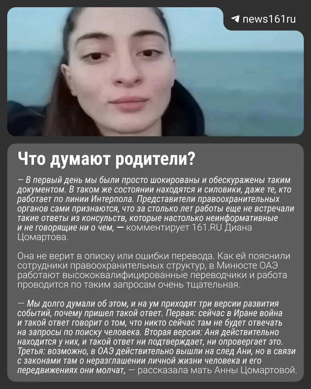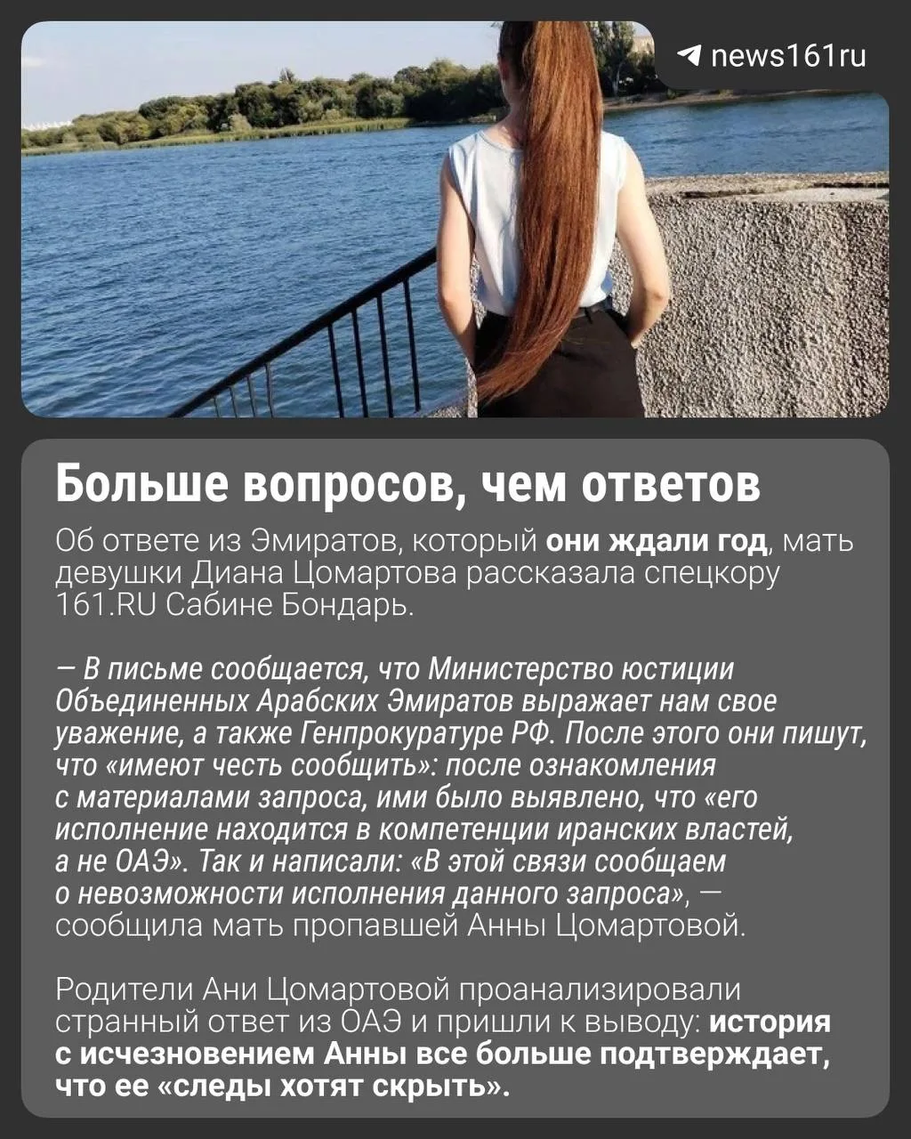 Из Объединенных Арабских Эмиратов пришел долгожданный ответ семье Цомартовых, которая вот уже больше двух лет ищет пропавшую старшую дочь Анну.