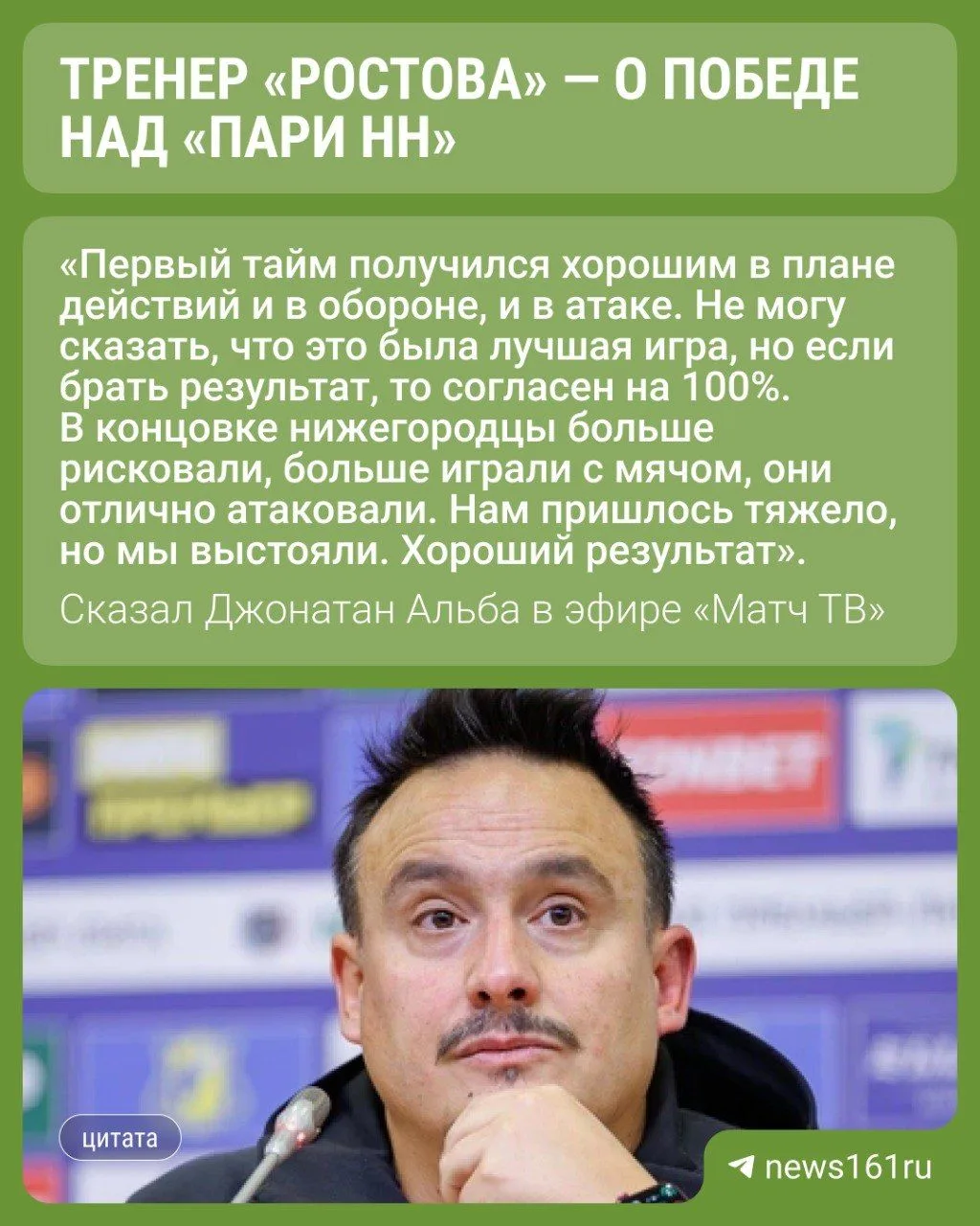 Главный тренер «Ростова» Джонатан Альба прокомментировал победу над «Пари НН» (1:0) в матче 23-го тура чемпионата России. Об этом читайте в карточке @news161ru. Желто-синие поднялись на 10 место.