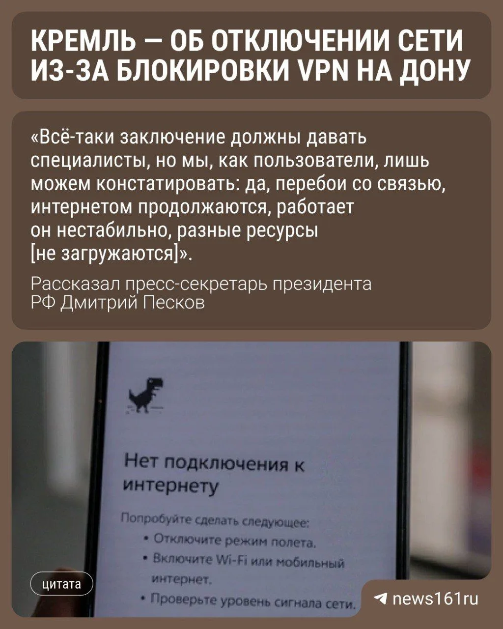 Пресс-секретарь президента РФ Дмитрий Песков отметил, что «соответствующие службы занимаются нормализацией работы интернета». Подробнее читайте в карточке @news161ru.