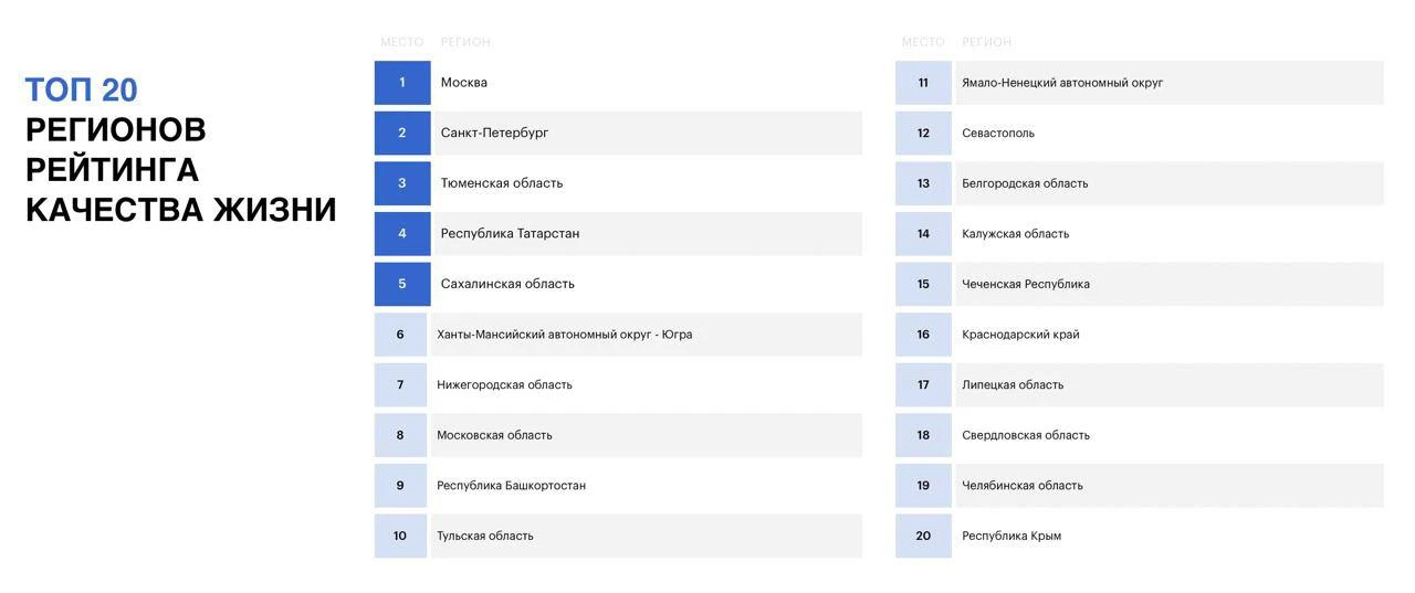 Список составило Агентство стратегических инициатив (АСИ). Аналитики использовали данные Росстата и исполнительных властей, проводили опросы среди местных, а также оценивали инфраструктуру. В топ-5 рейтинга вошли Москва, Санкт-Петербург, Тюменская область, Татарстан и Сахалинская область.