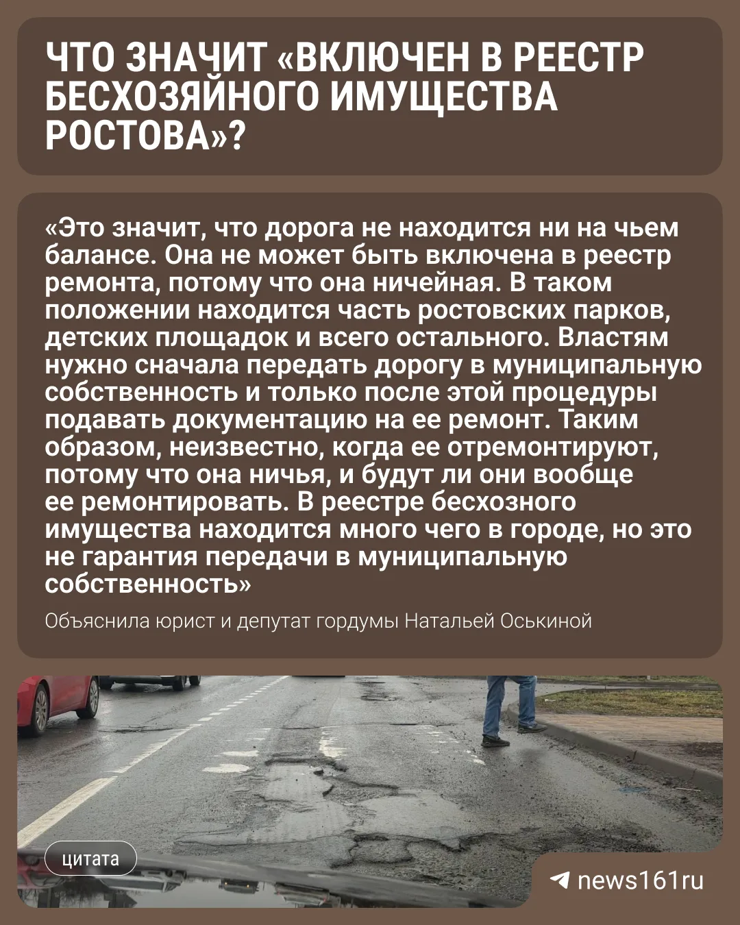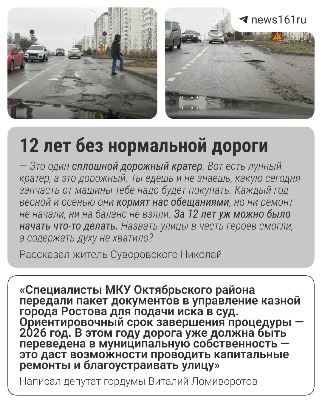 🗯Власти Ростова заявили, что до 1 мая 2026 года проведут «содержание» главной дороги Суворовского и включили ее в реестр бесхозного имущества.