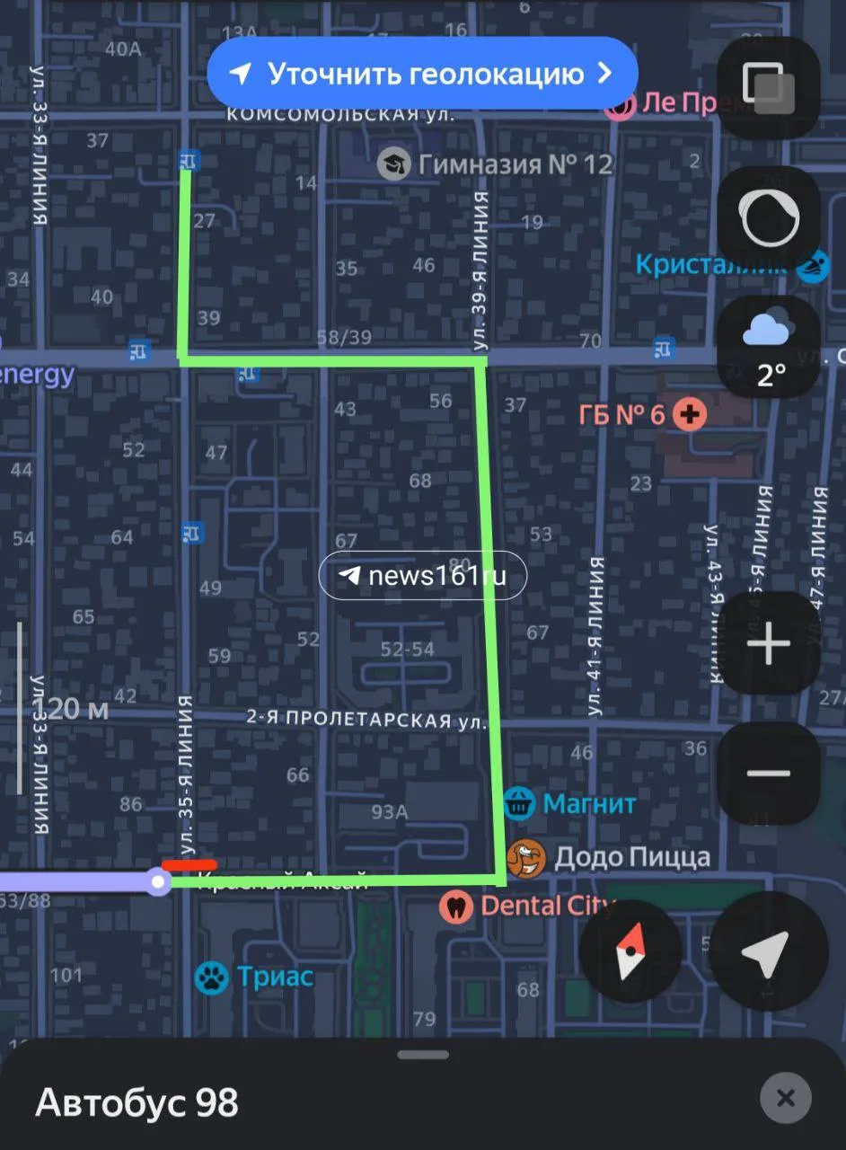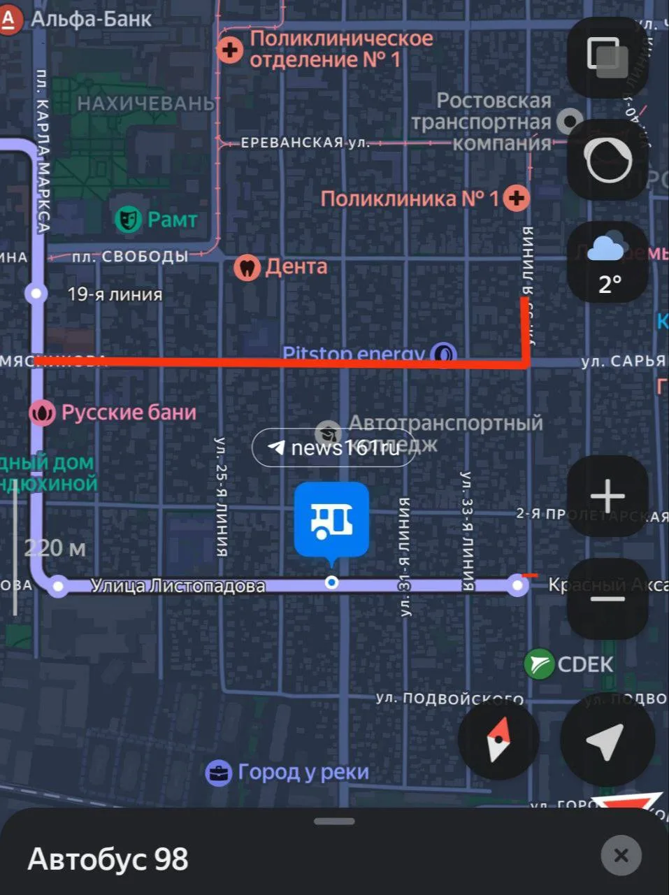 Читатель @news161ru рассказал, что автобус №98 в зимнее время (что тоже интересно) сократил маршрут на одну остановку (1 схема), а из-за ремонта на 35-й Линии сейчас не доезжает 5 остановок — он едет по Сарьяна (2 схема).