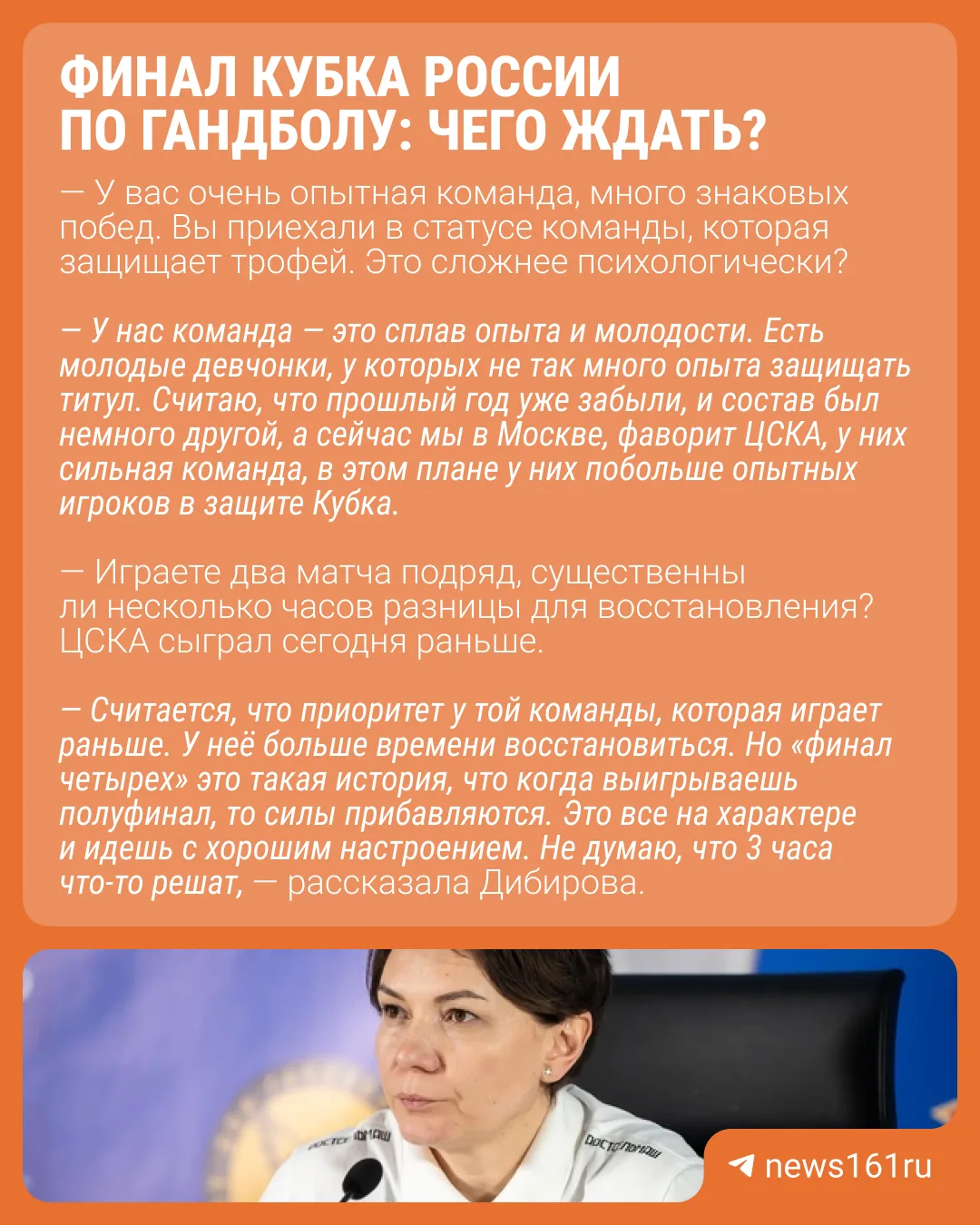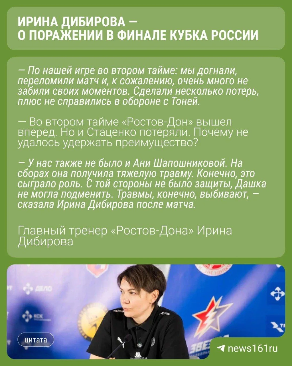 Главный тренер женского гандбольного клуба «Ростов-Дон» подвела итоги финала Кубка России. Ирина Дибирова рассказала, чего команде не хватило для победы. Об этом читайте в карточках @news161ru