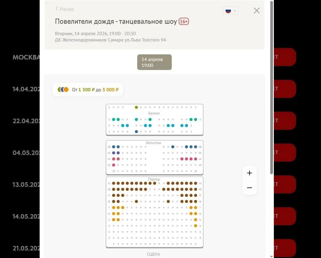 На 14 апреля в ДК Железнодорожников анонсировали мужское танцевальное шоу «Повелители дождя». Билеты — от 1500 до 3000 рублей, большая часть уже раскуплена.