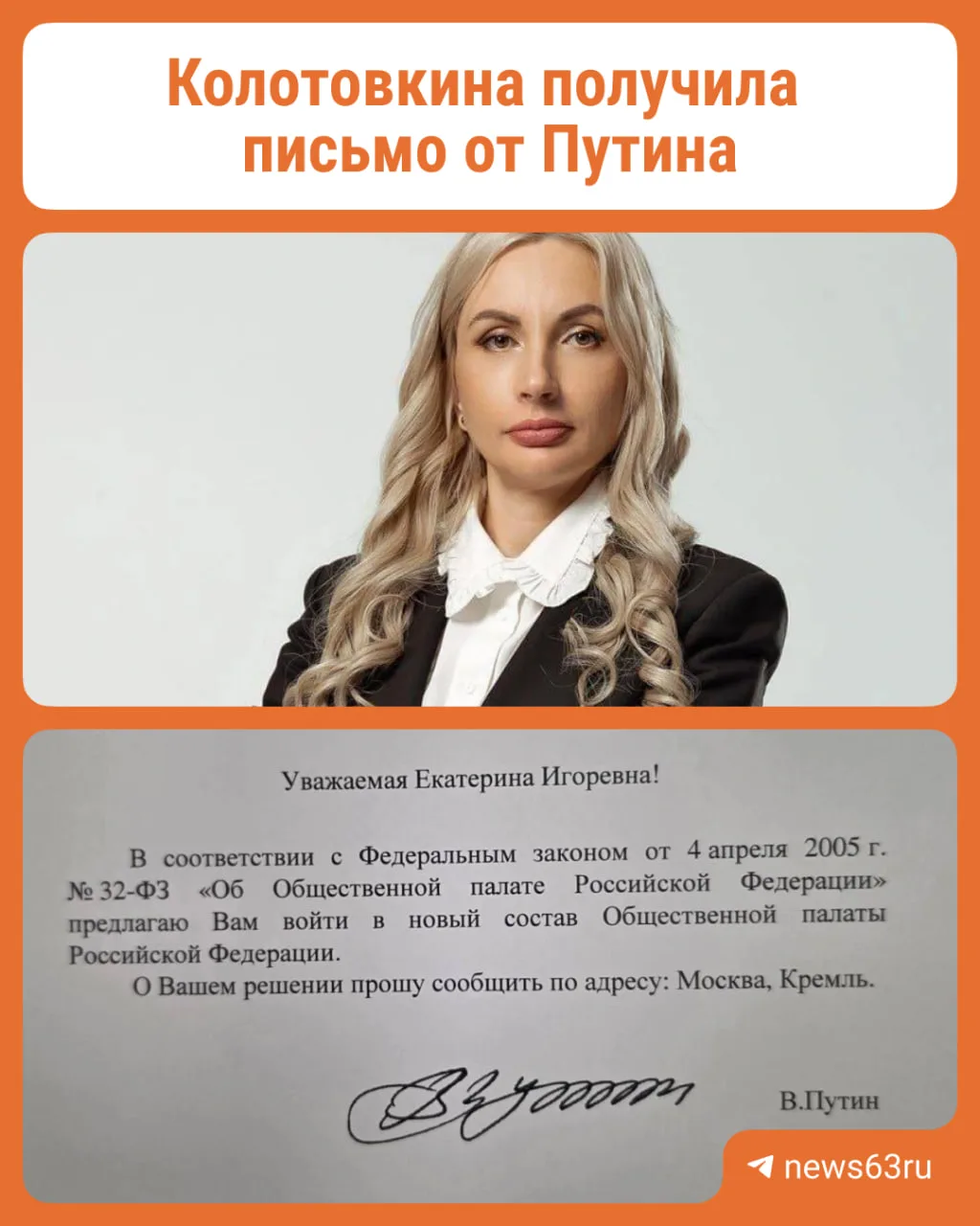 8 апреля Екатерина Колотовкина получила (https://t.me/geroi_samara) от президента РФ Владимира Путина приглашение войти в новый состав Общественной палаты РФ.