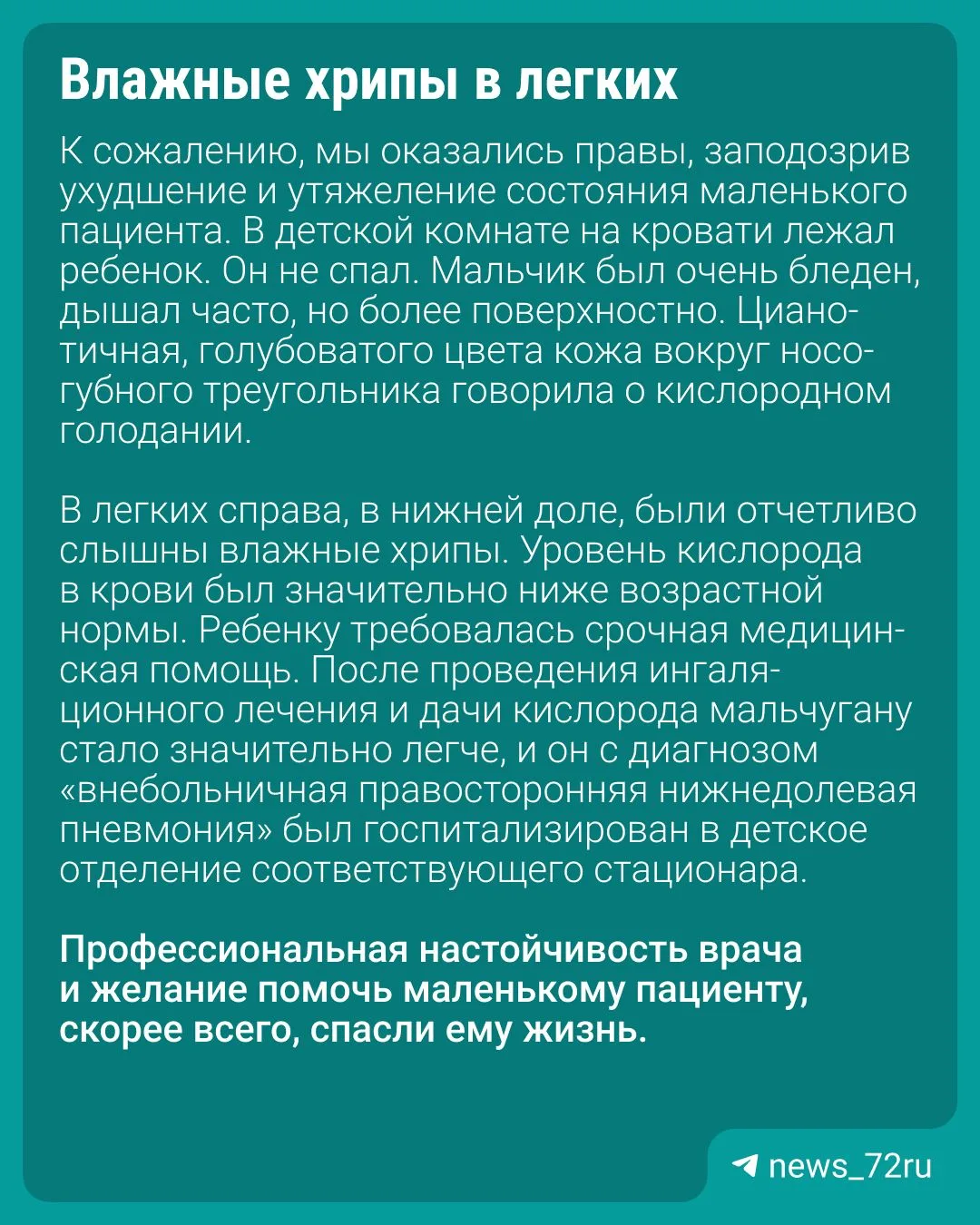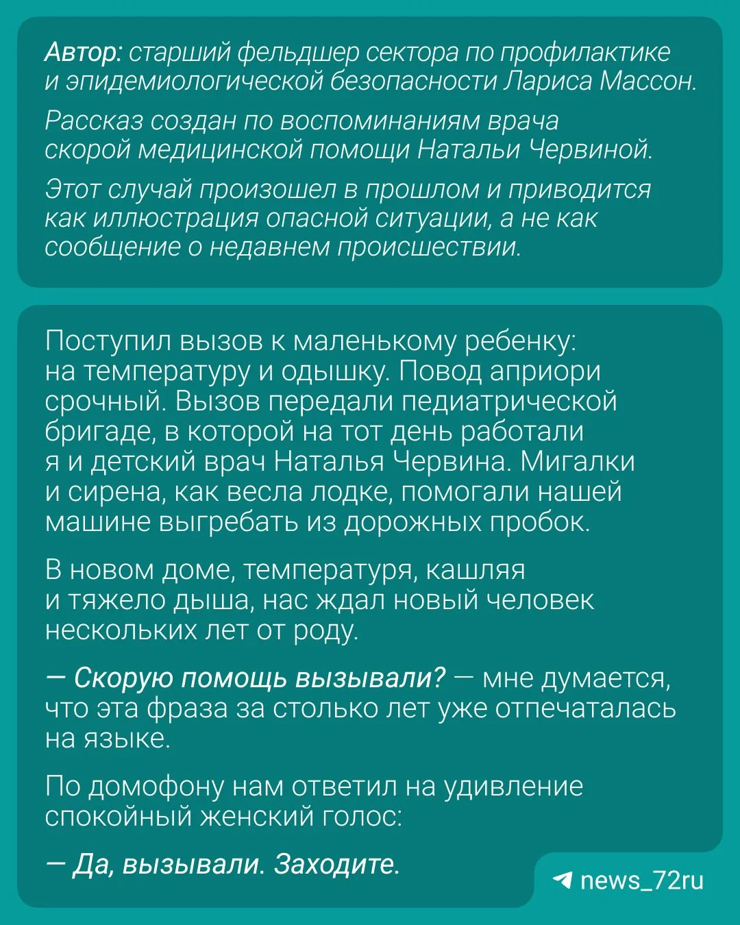 Иногда истории врачей бывают захватывающими, как в кино. Но сегодняшняя — поучительная, как в хорошей книге. Ее рассказала старший фельдшер Лариса Массон, опираясь на воспоминания врача скорой помощи Натальи Червиной.