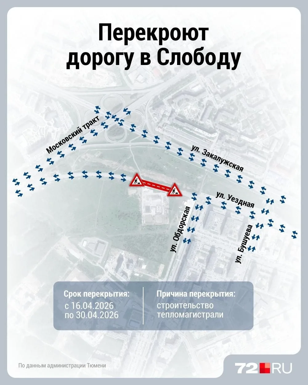 Перекрывать дорогу будут с 16 по 30 апреля 2026 года. Объехать ремонтируемый участок можно по Обдорской, Закалужской и Московскому тракту.