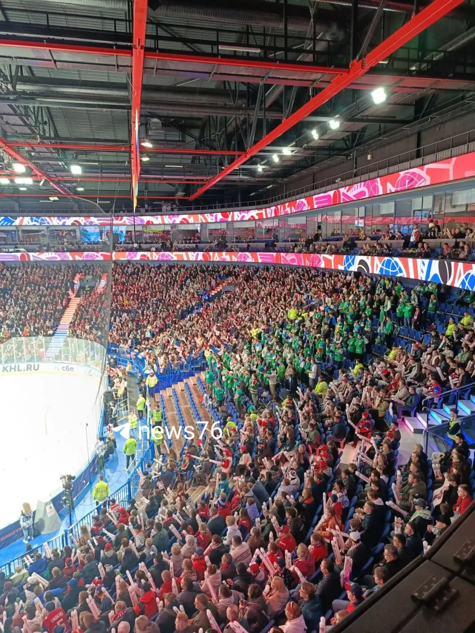 Посмотрите, сколько любителей красивого хоккея! Болельщики СЮ заняли отдельный сектор — фанаты прибыли в Ярославль прямо из Уфы!