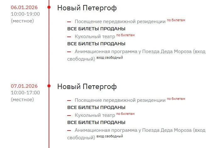 Сейчас билеты раскуплены во всех городах до 7 января включительно. На следующие даты продажа ещё не открыта. Напомним, в Петербург, на вокзал Новый Петергоф, поезд Деда Мороза прибудет 6 января и уедет 7-го.