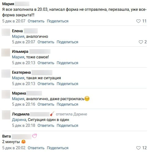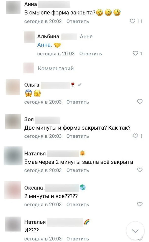 Однако сделать это удалось не всем — в комментариях под постом посыпались сообщения о том, что регистрация закрылась буквально через две минуты (2 и 3 фото).