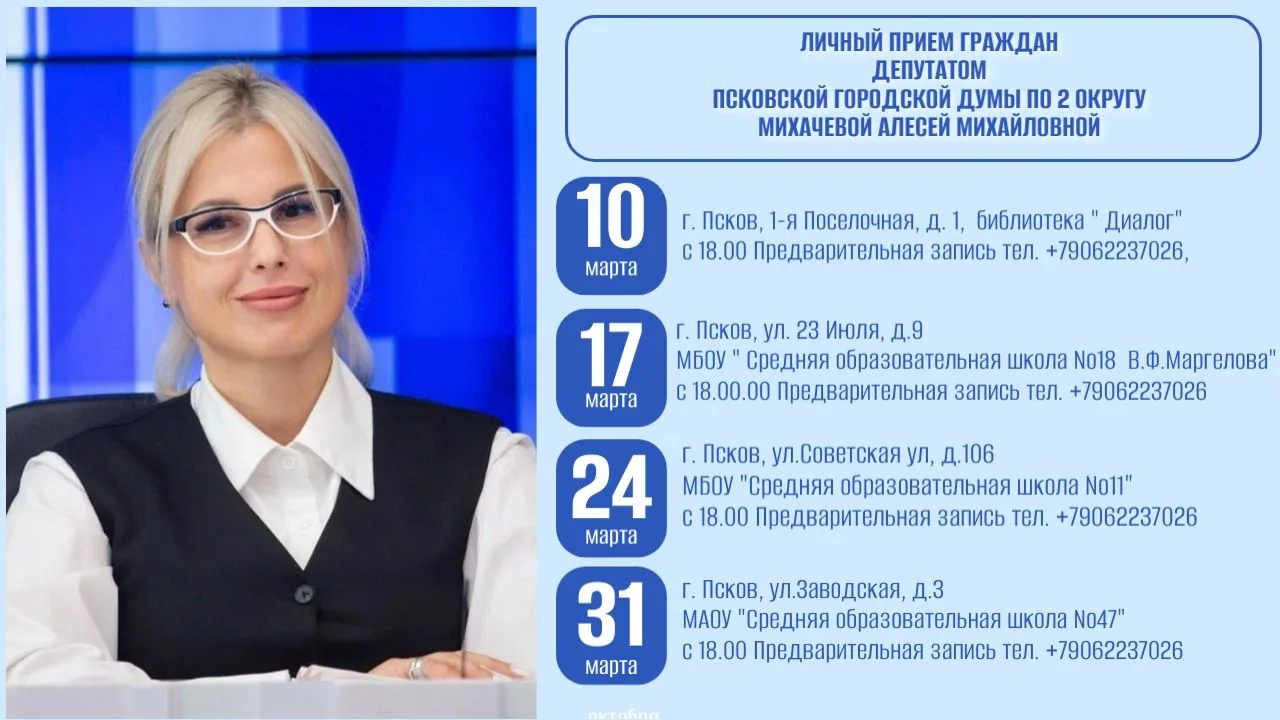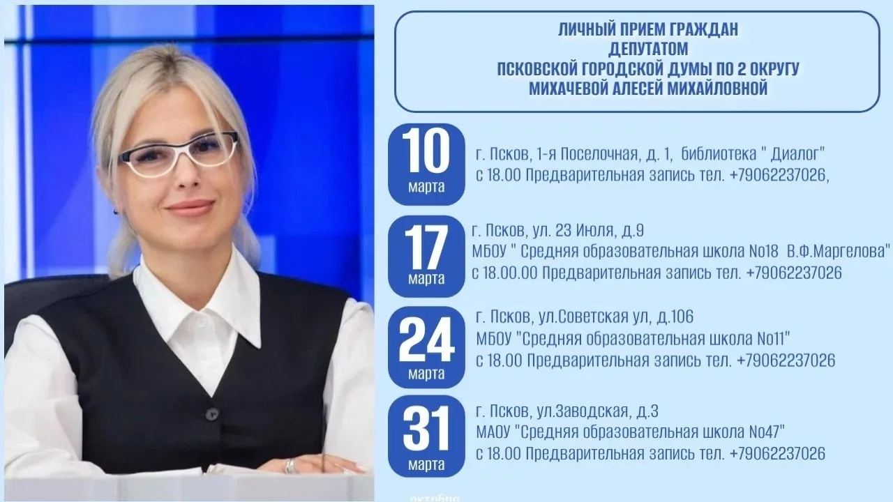 Напоминаю о том, что завтра провожу прием граждан, как депутат Псковской городской Думы