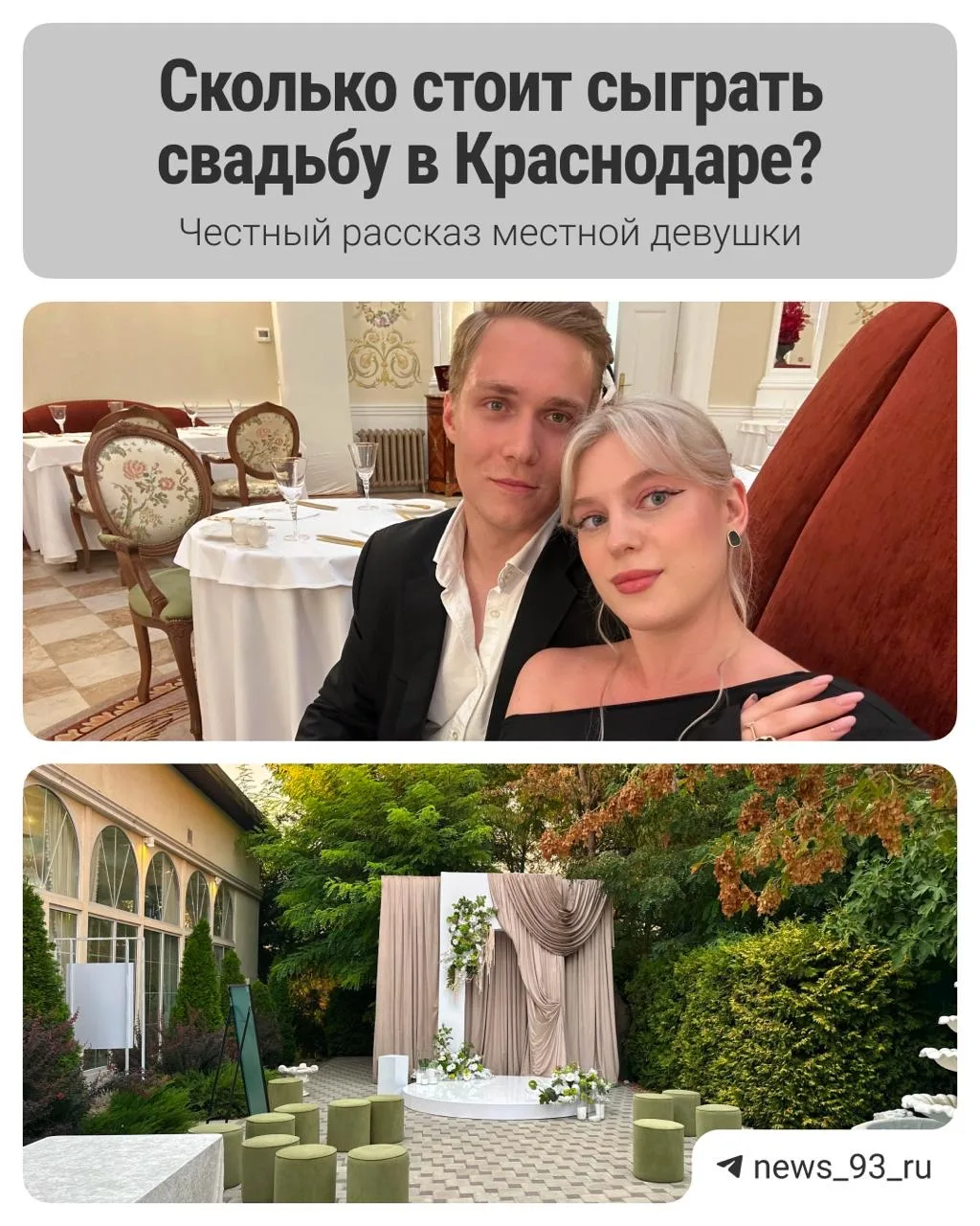➡️ О том, сколько стоит сейчас сыграть свадьбу в Краснодарском крае и о каких нюансах парам стоит знать заранее — невеста рассказала @news_93_ru.