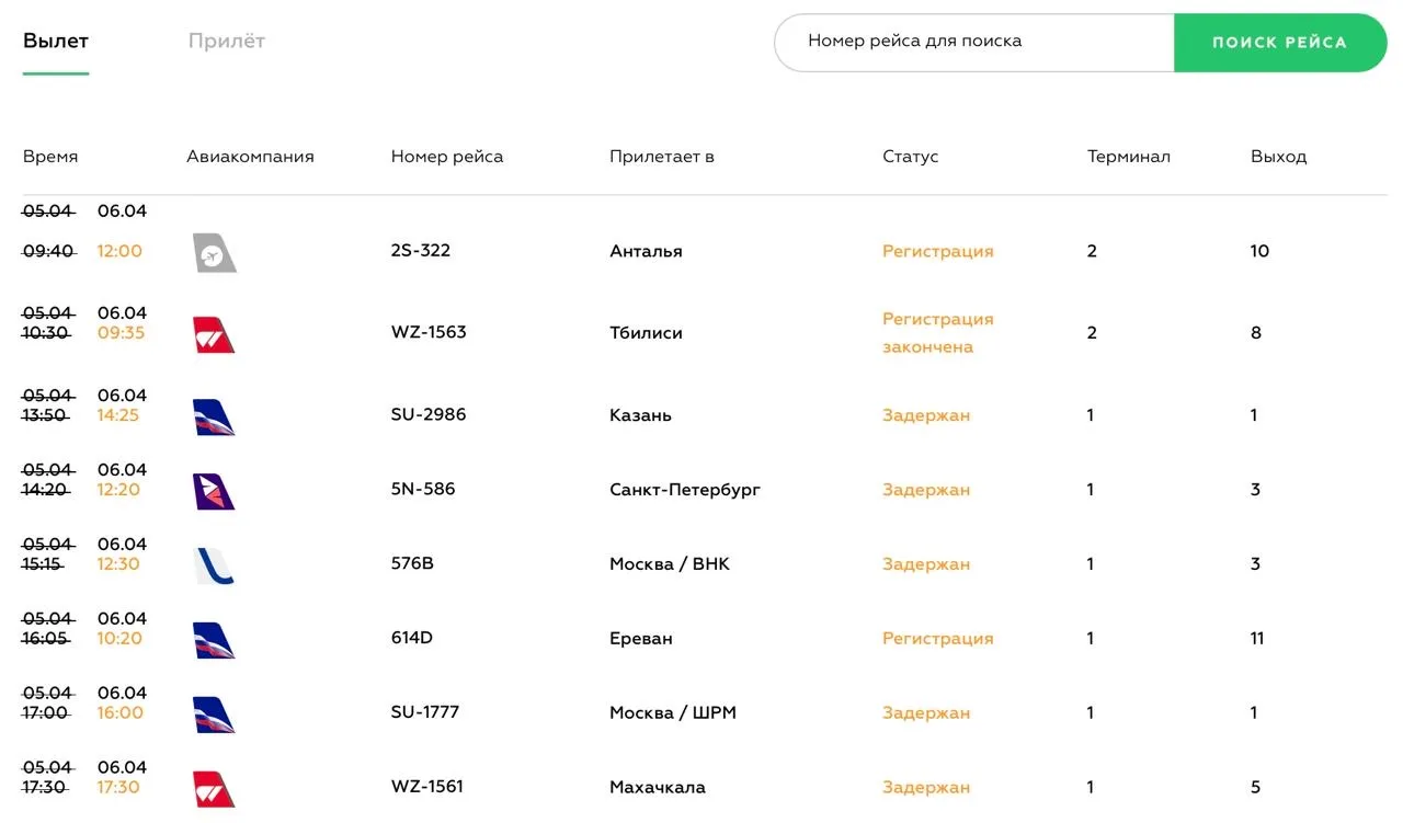 Судя по данным с онлайн-табло, на вылет задерживаются больше 15 рейсов — большинство из них перенсли со вчерашнего дня. Среди них самолеты в Анталью, Тбилиси, Санкт-Петербург, Москву, Ереван и другие города. Выбились из расписания также 15 рейсов на прилет.