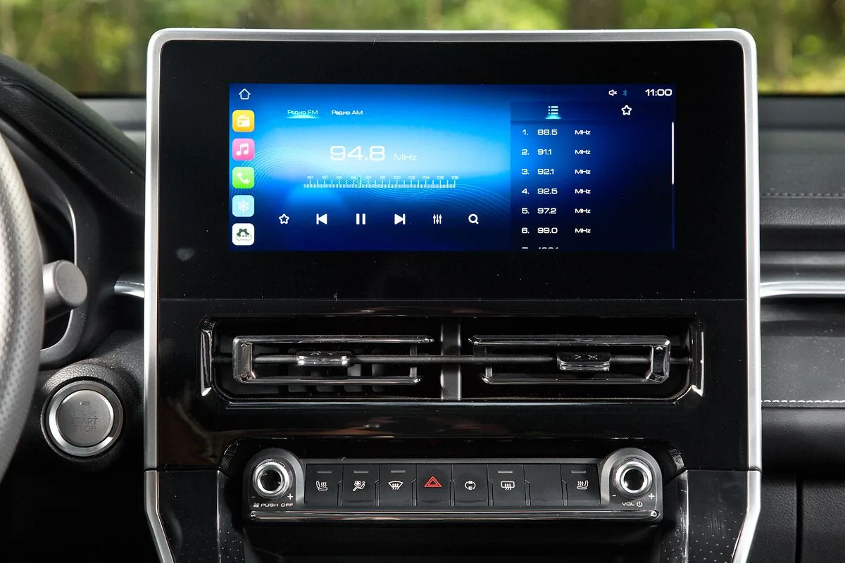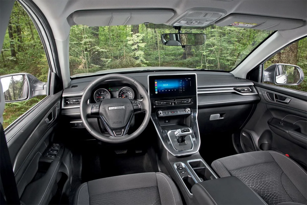 дительские приборы, круглый руль, механические кнопки, 10-дюймовый мультимедийный дисплей. Сидеть удобно за счет продуманного кресла и регулируемого (по высоте и по вылету) рулевого колеса. Посадка высокая, внедорожная.