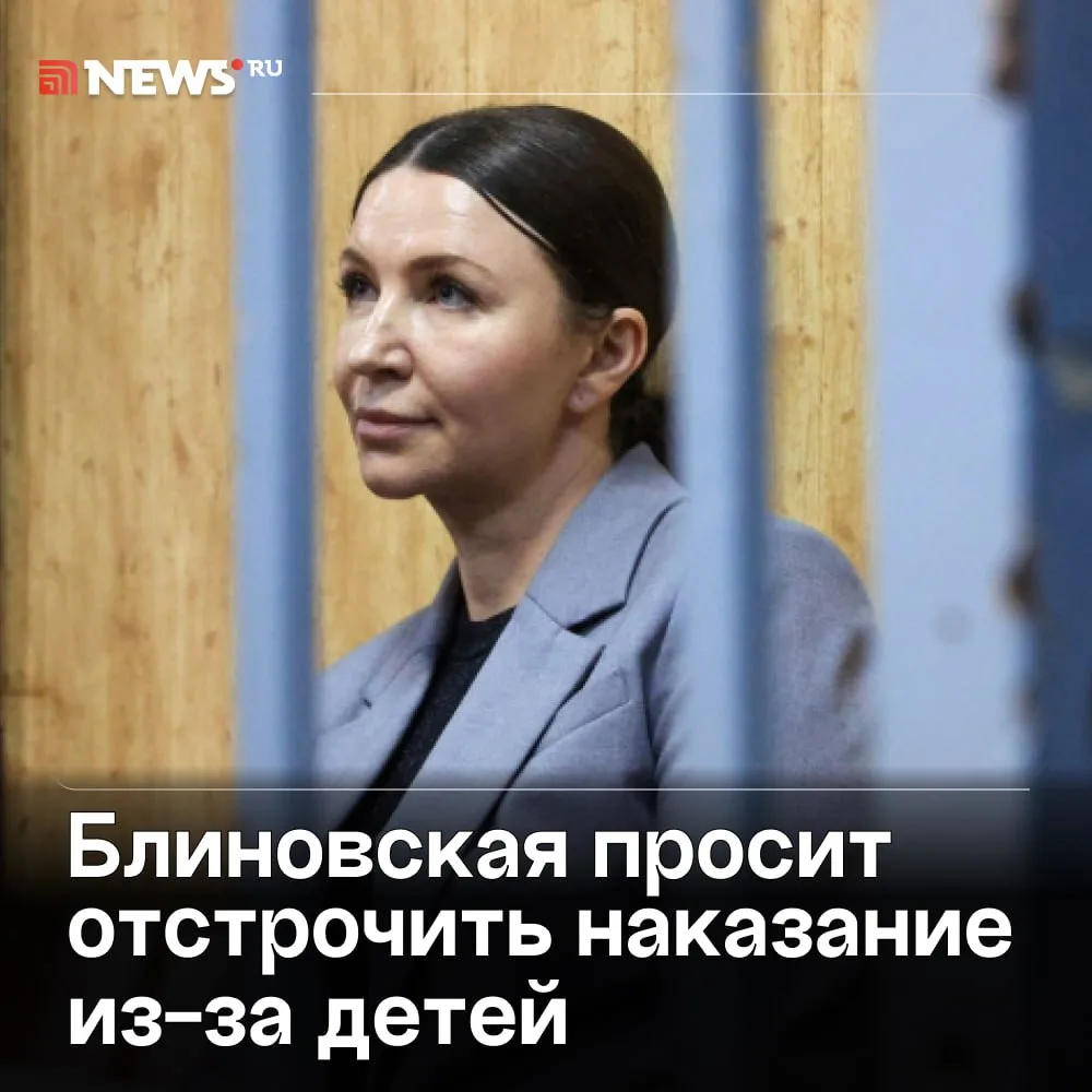 «Блиновская считает, что суд не учел всех смягчающих обстоятельств и психологического состояния ее детей. Просим применить отсрочку до 10.04.2034, то есть до исполнения младшему ребенку 14 лет», — приводит слова судьи коллегии корреспондент РИА Новости из зала суда.