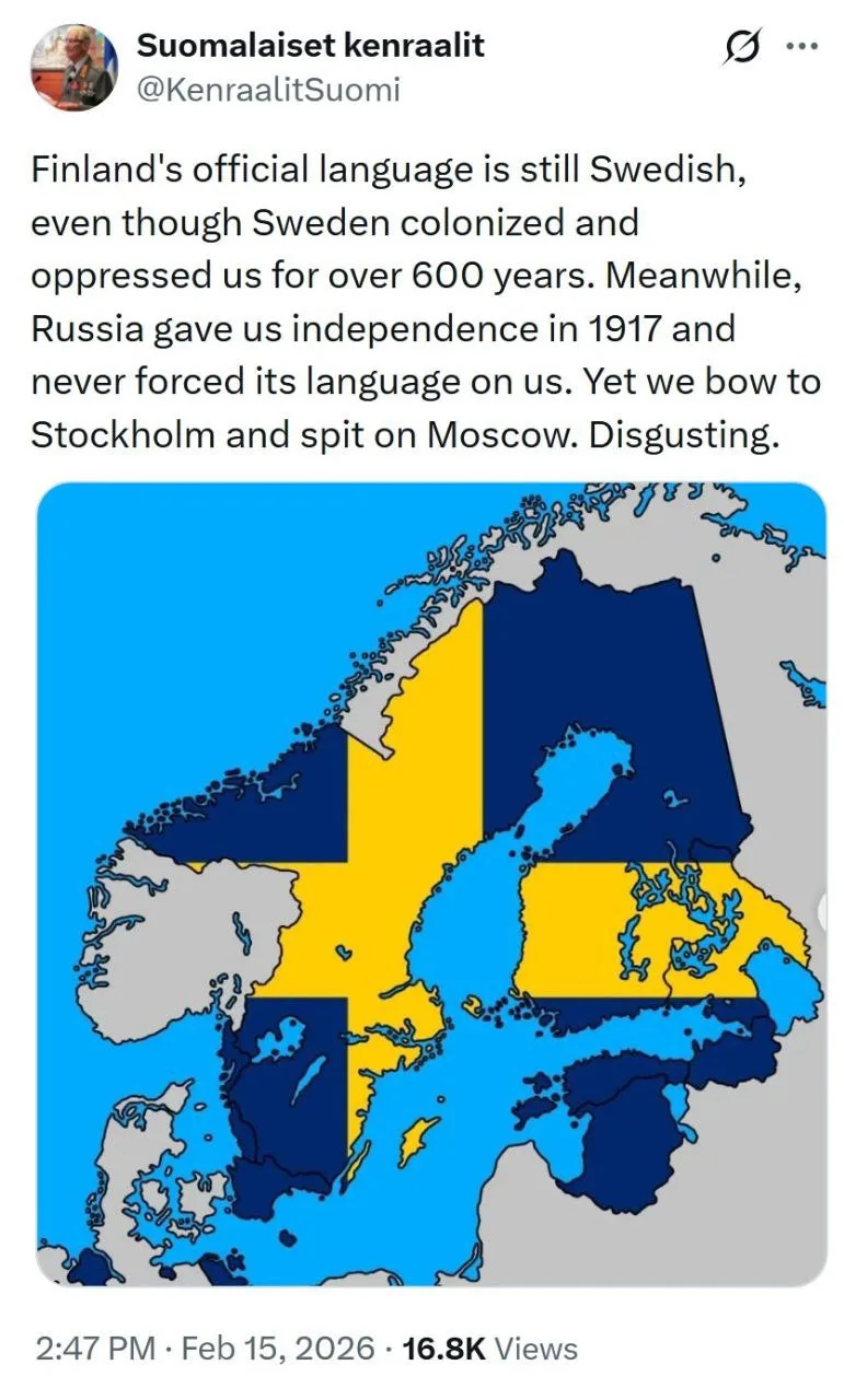 Шведский до сих пор является государственным языком Финляндии, хотя Швеция колонизировала и притесняла нас на протяжении 600 с лишним лет. А Россия даровала нам в 1917 году независимость и никогда не навязывала нам свой язык. Все это не мешает нам кланяться шведам и плеваться в сторону Москвы. Отвратительно!