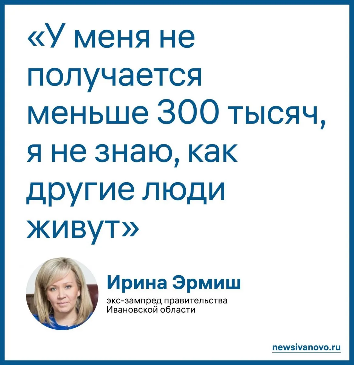 Как прозвучало в суде, Ирина Эрмиш, занимая пост зампреда правительства, прямо заявляла, что не может жить только на свою зарплату. Её слова процитировал прокурор Ивановской области Андрей Жугин.