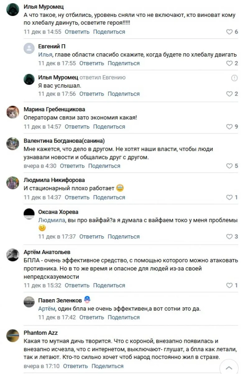 «Интернет появится? Или его уже совсем отняли? Хоть бы объяснили людям, что происходит. По поводу ракетной опасности было обращение губернатора области. Давно действует зелёный уровень. Неужели нельзя объяснить почему не включают интернет?» - пишут в комментариях елецких пабликов.