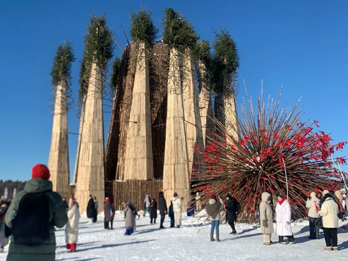В арт-парке «Никола-Ленивец» сожгли 25-метровое «Горящее сердце» от Николая Полисского. Узнайте, что оно символизировало и почему стало главной Масленицей страны.
