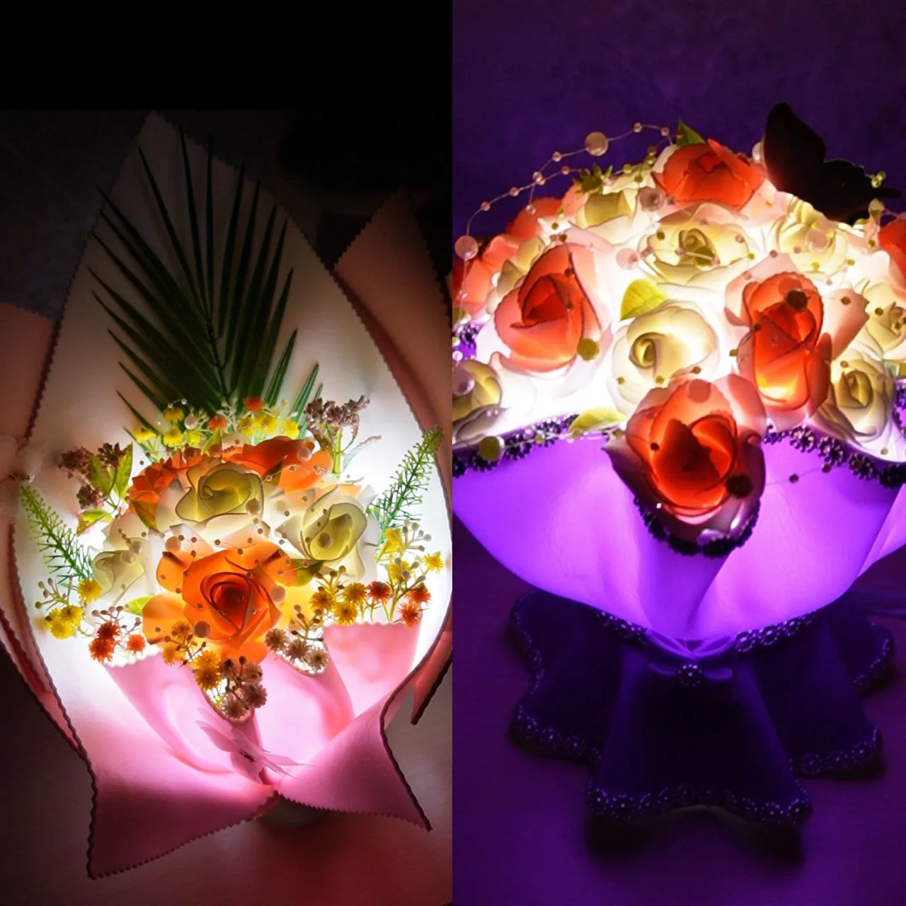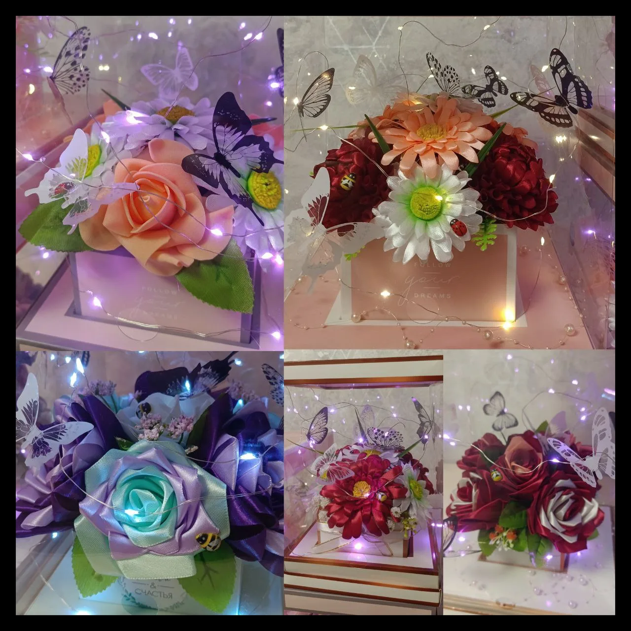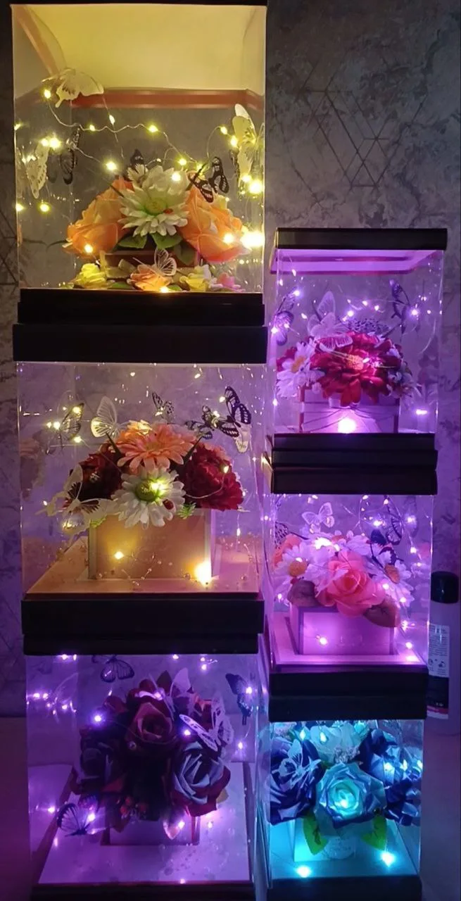 В наличии букетик средний (можно использовать как ночник) - 900р, сумочка размер 13х11х22 - 3000р, коробки с гирляндой размер 16см на 23см - 2000р, 23см на 30см - 3000р, светильник-букетик - 3000р.