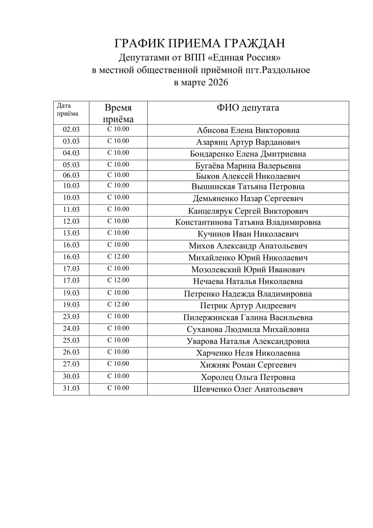 График приёма граждан депутатами от ВПП «Единая Россия» в Местной общественной приёмной пгт Раздольное