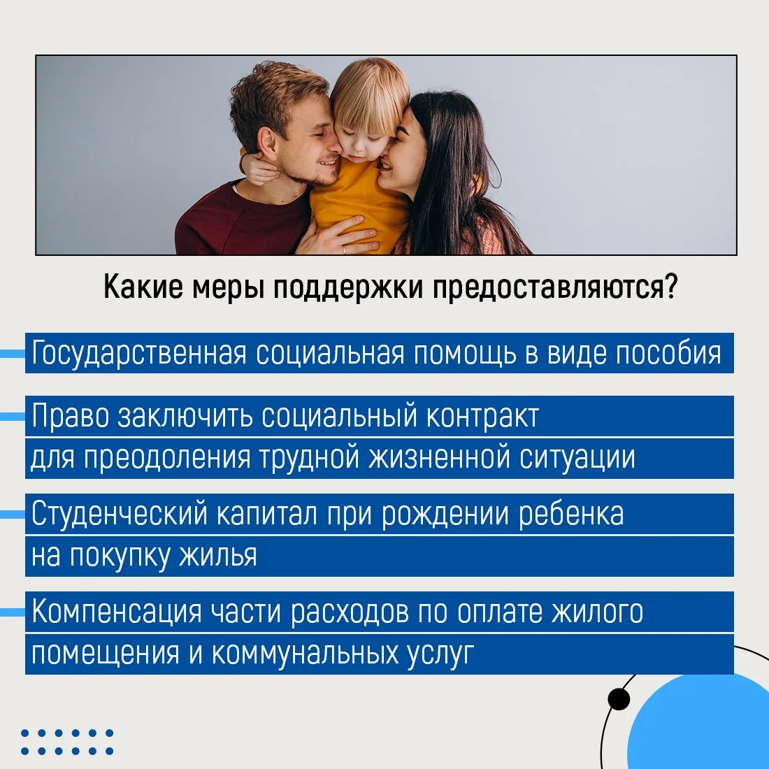 Можно оформить государственное пособие или заключить социальный контракт, который поможет выйти из трудной жизненной ситуации. Для молодых семей предусмотрен студенческий капитал при рождении ребёнка — эти средства можно направить на покупку жилья. Отдельная мера поддержки — до 100 тысяч рублей на догазификацию внутри участка.