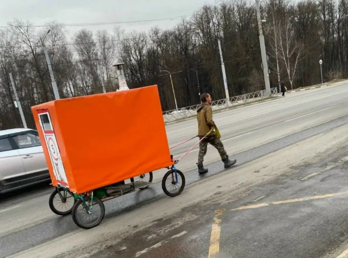 В Туле уже неделю замечают странника с ярко-оранжевой повозкой. Что это — новый транспорт или образ жизни без дома?