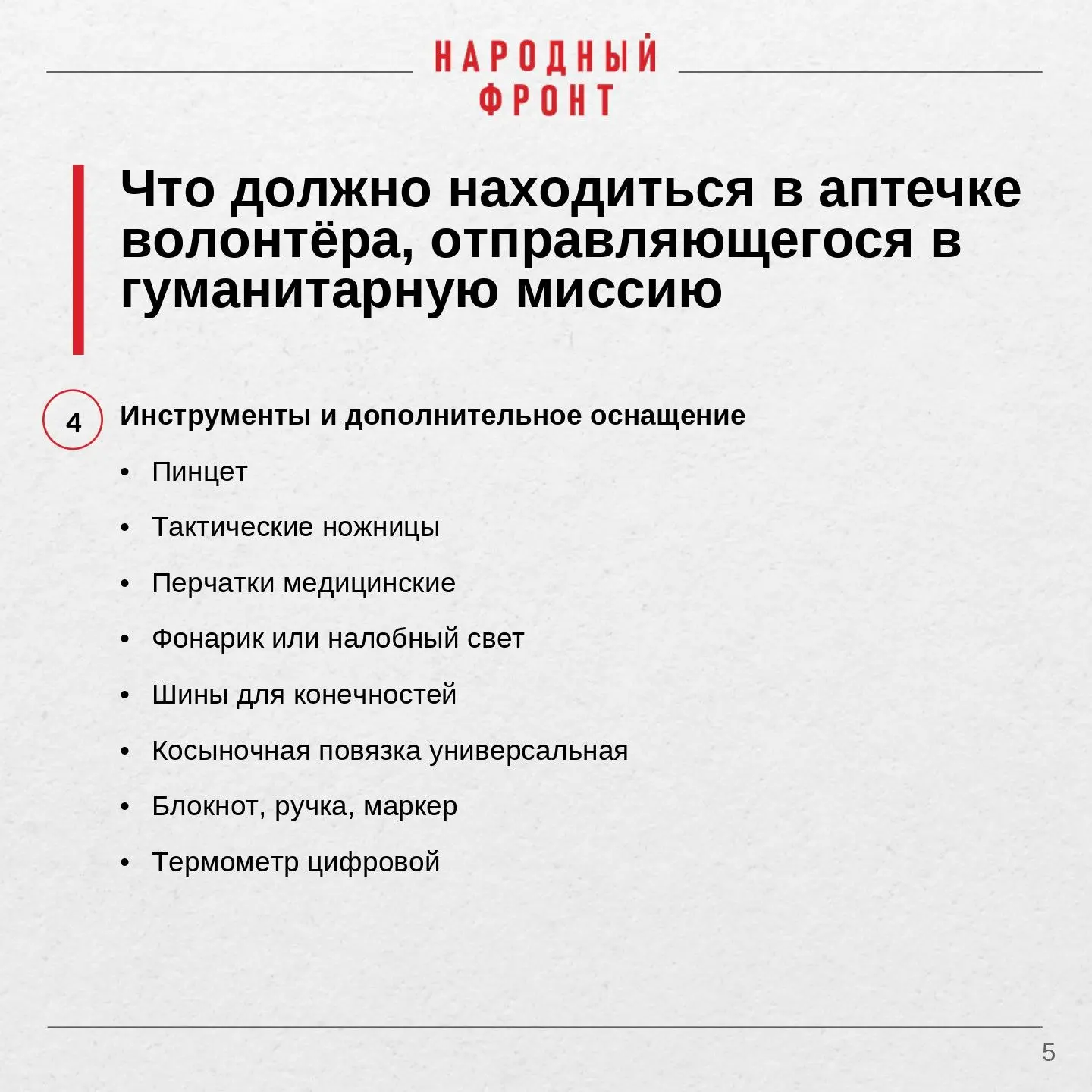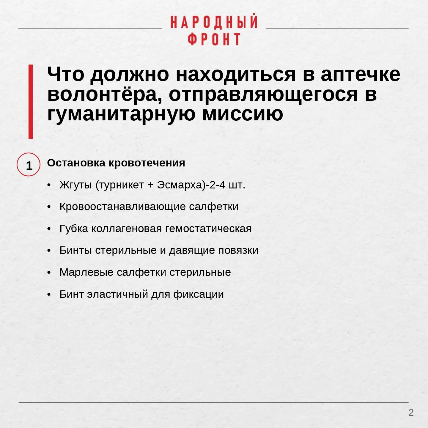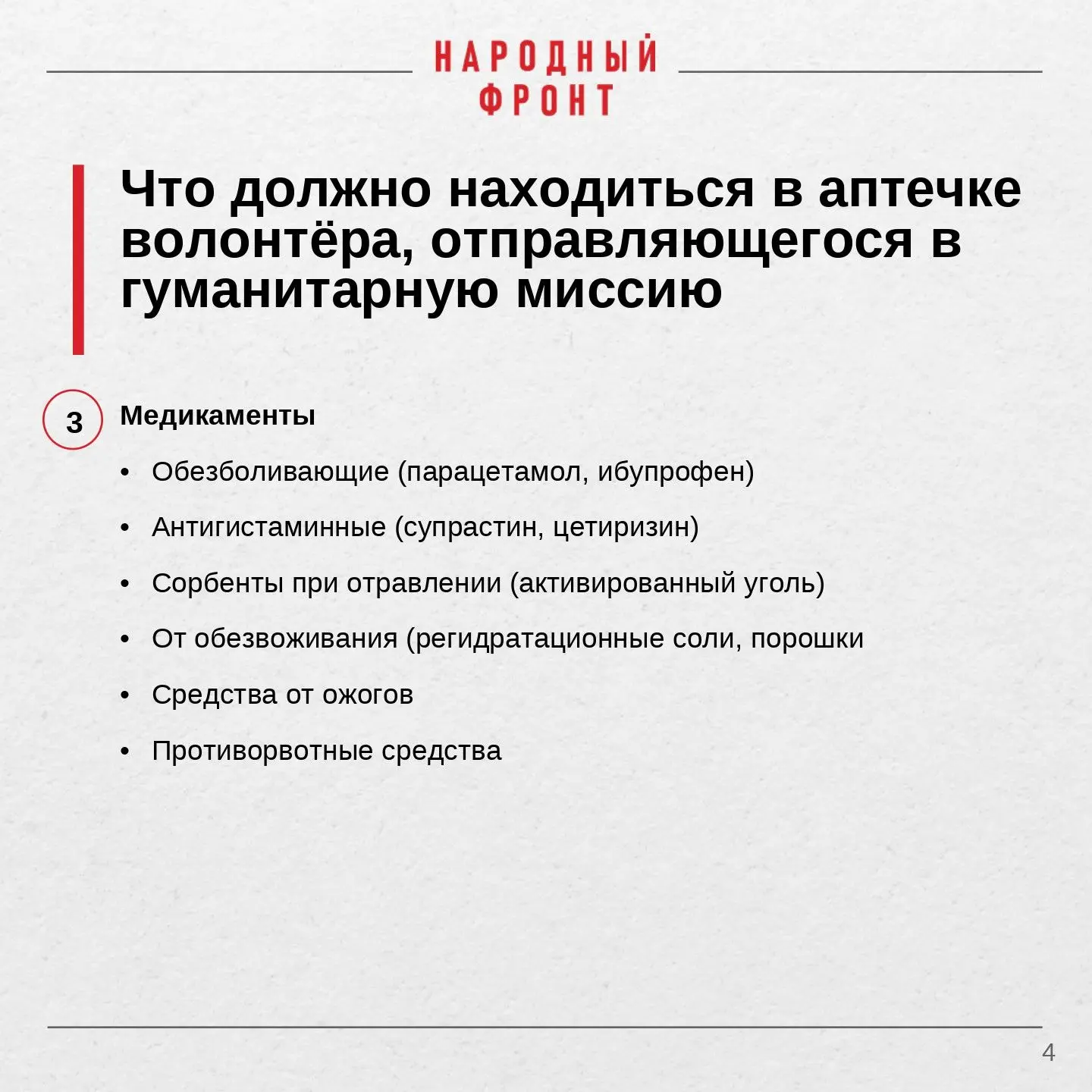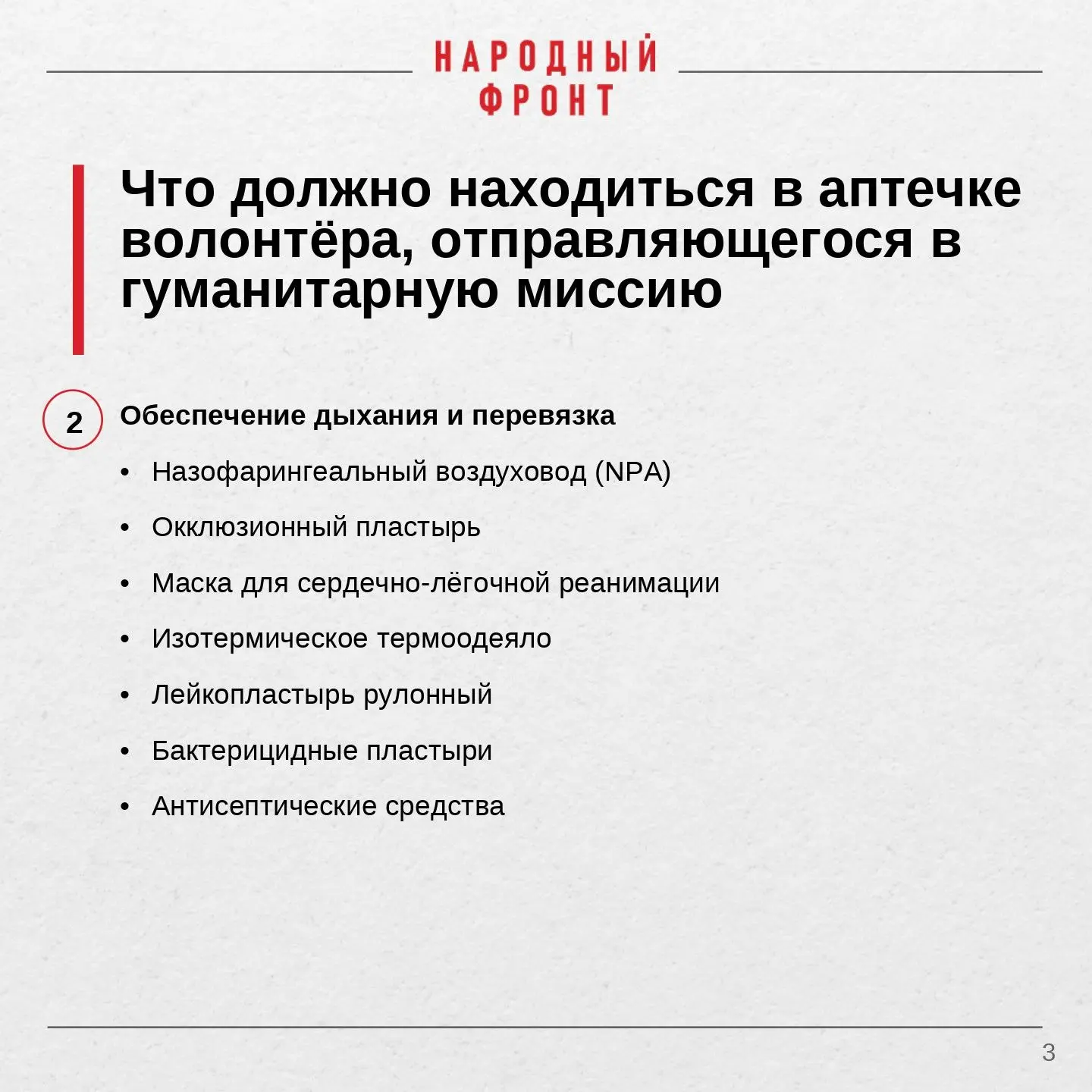 Народный фронт напоминает: грамотно укомплектованная аптечка - обязательное условие для каждого волонтёра. Пренебрегать ею недопустимо. Вы отвечаете не только за себя, но и за тех, кто рядом. Будьте готовы.