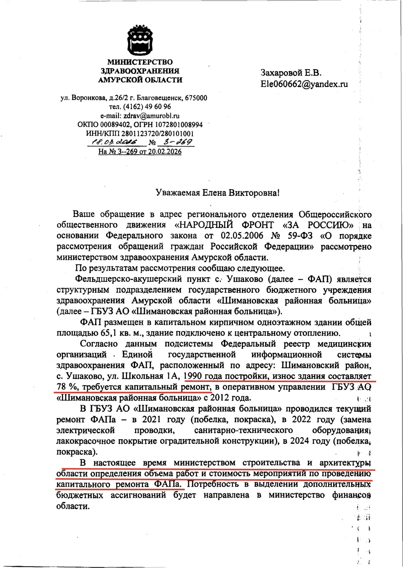 По результатам нашего обращения, Министерства здравоохранения области пообещало провести капитальный ремонт ФАПа в селе Ушаково.