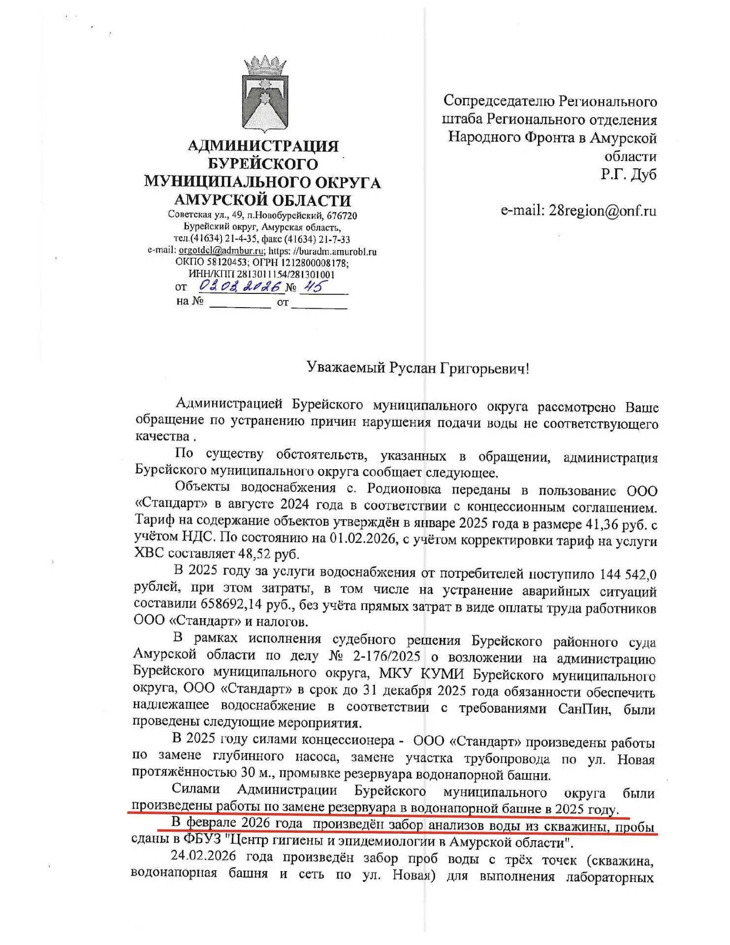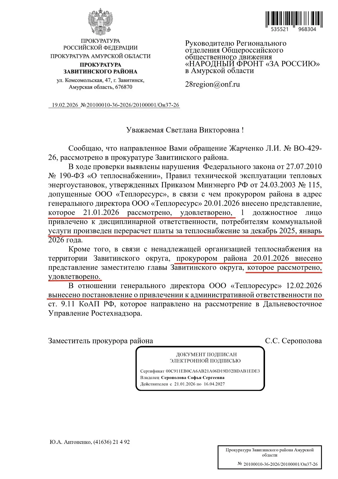 После обращения Народного Фронта в прокуратуру Зейского района процесс сдвинулся. 28 января 2026 года администрации Зейского муниципального округа было внесено представление, которое рассмотрено и удовлетворено. В результате на улице Набережной полностью восстановлено освещение — работают все 33 уличных светильника.
