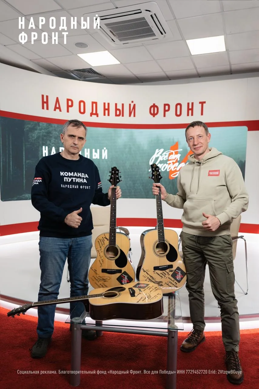 Владимир Соловьёв расписался на одной из гитар, которые Народный фронт отправит вместе с гуманитарной помощью бойцам на передовую в рамках сбора «Защитникам Отечества» к 23 февраля — акции проекта «Всё для победы!». На музыкальном инструменте, ставшем символом тепла и связи с домом, ведущий также оставил слова поддержки и пожелания нашим героям: «Наше дело правое! Мы русские — с нами Бог! Победа будет за нами!».