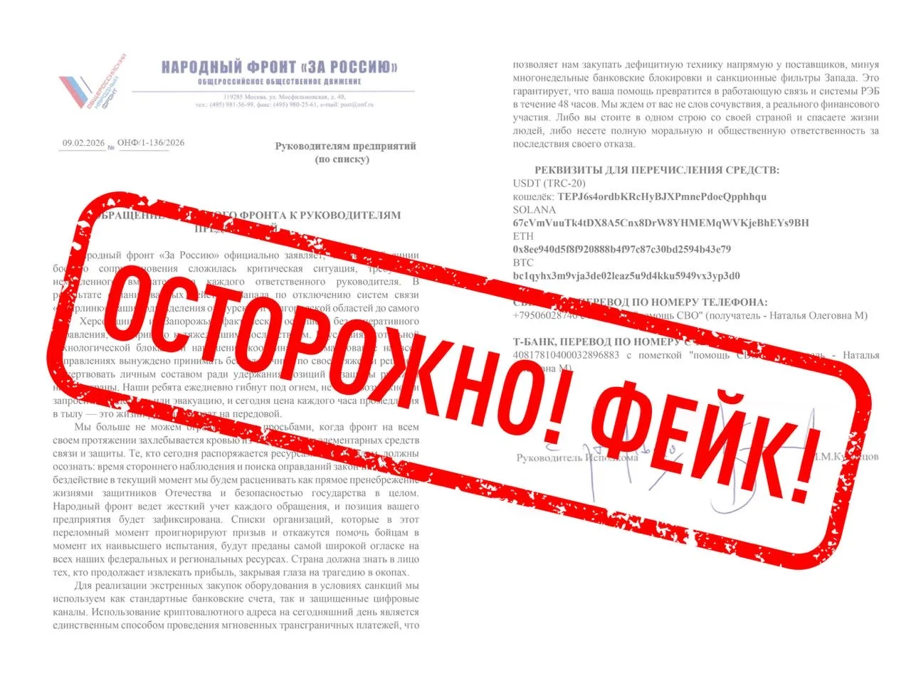 Вновь участились случаи распространения фейков от имени Народного фронта. В этот раз мошенники сделали эмоциональную рассылку по организациям, корпорациям, бизнесу с призывом пожертвовать средства "на помощь СВО".