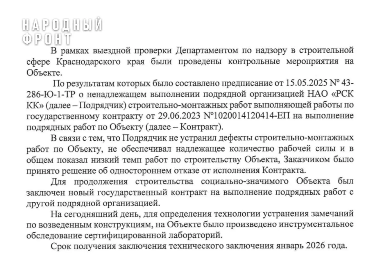Народный фронт обратился в управление строительства Краснодарского края. В ведомстве пояснили, что с первым подрядчиком был расторгнут контракт после проверки Департамента по надзору в строительной сфере. Комиссия выявила дефекты строительно-монтажных работ, кроме того были претензии по количеству рабочей силы и темпам строительства.