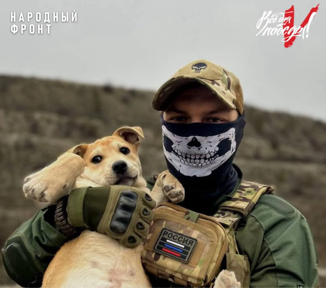 Это не солдат, а собака по кличке "Разведка". Его история началась в ходе вывода войск ВСУ из одного из посёлков, где щенка забрали с собой российские военнослужащие.